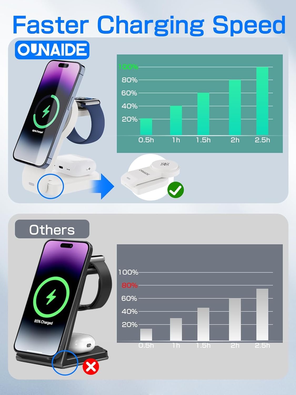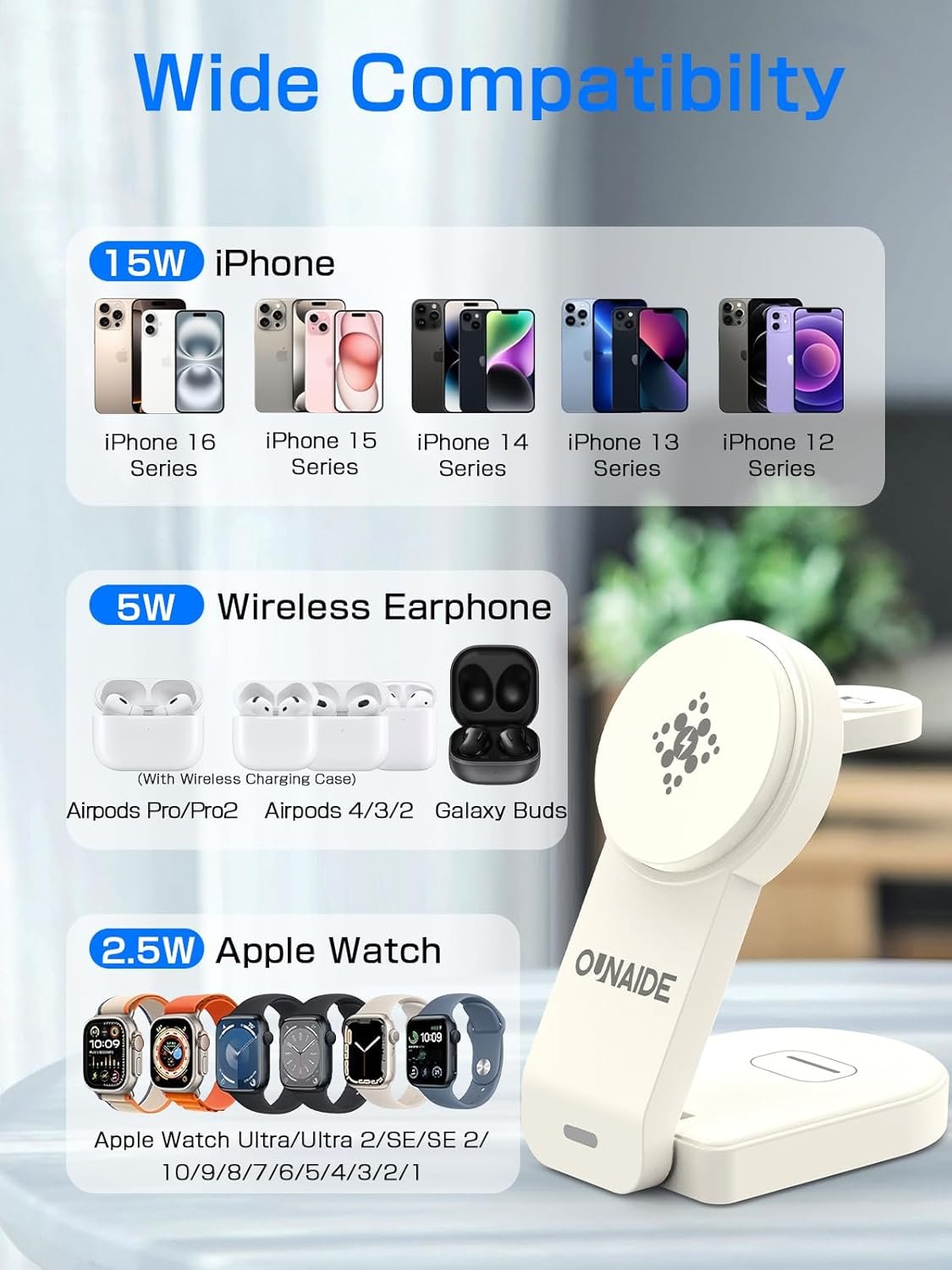【Wide Compatiblity】: OUNAIDE’s 3 in 1 wireless charger for Apple is compatible with iPhone 16/15/14/13/12 series(iPhone 8-11 series must Compatible with Magsafe case), for Apple Watch Ultra2/Ultra/SE 2/SE/10/9/8/7/6/5/4/3/2,for AirPods Pro 2/Pro/4/3/2 and other wireless earphones with QI function. (Other Android phones with wireless charging function can also be used, but you need to lay the product flat on the charger or use a magnetic phone case. )