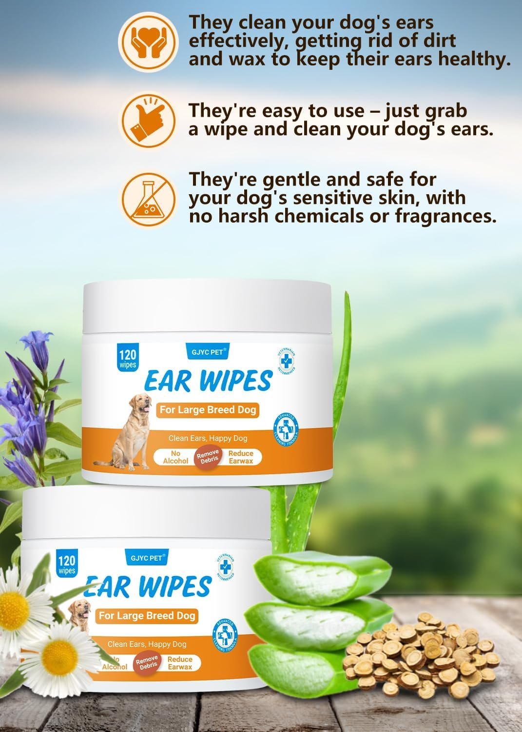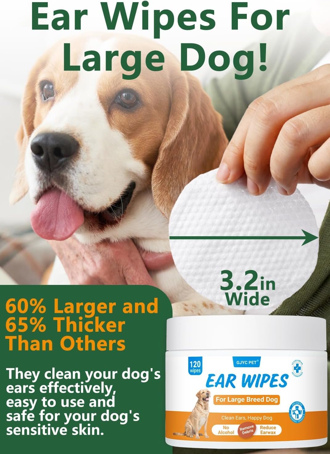 Thick and Wide Disposable Wipes:Includes 120 thick and wide ear cleaning Wipes, each measuring 3.2 inches. These soothing, non-irritating pads are perfect for dogs and cats over 12 weeks old.