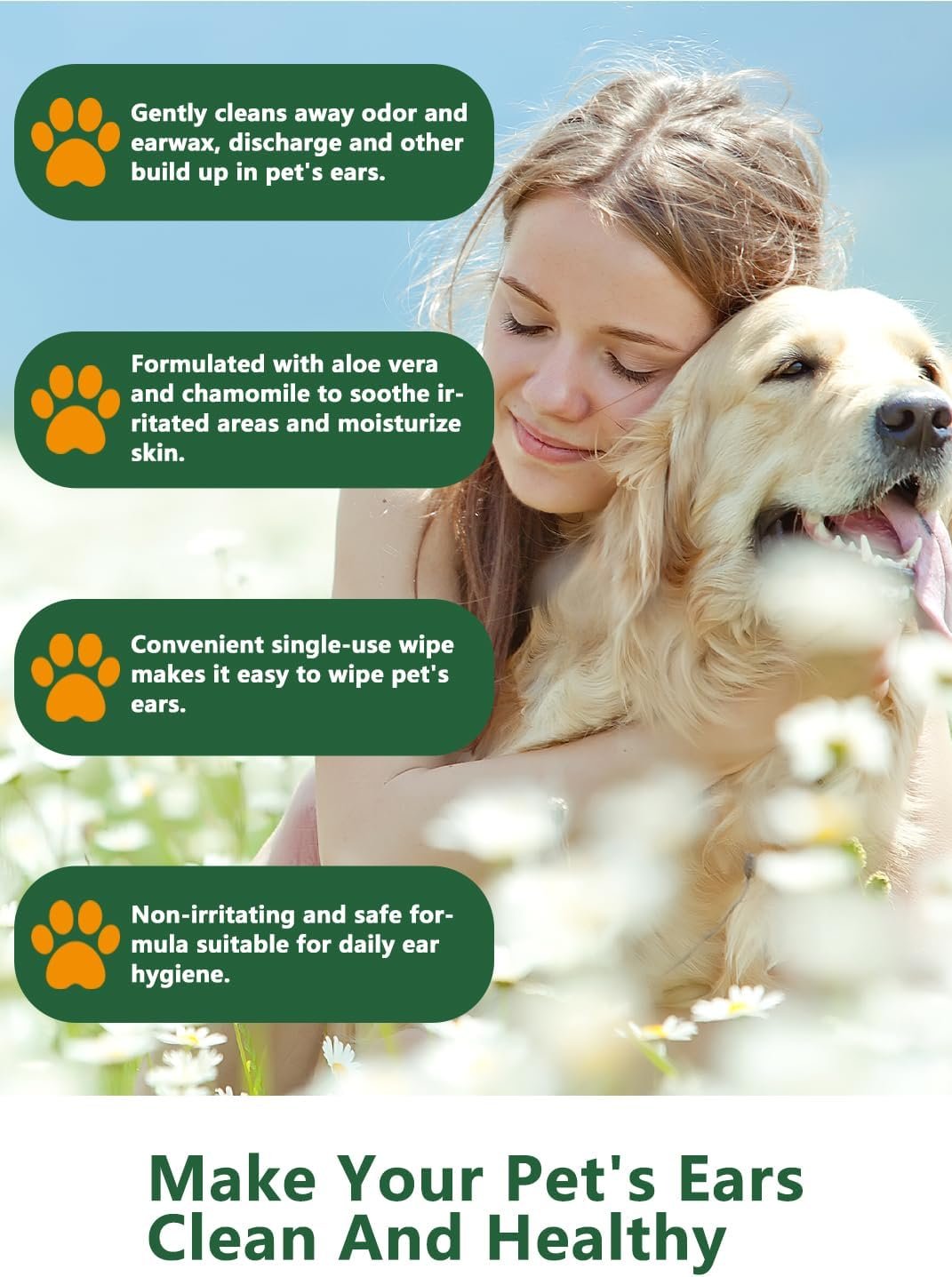Deodorizing and Cleaning:Keep your pet’s ears clean and deodorized with our advanced wipes. Suitable for large dogs and other pets, these wipes maintain ear health and prevent infections, making them a must-have for every pet owner.