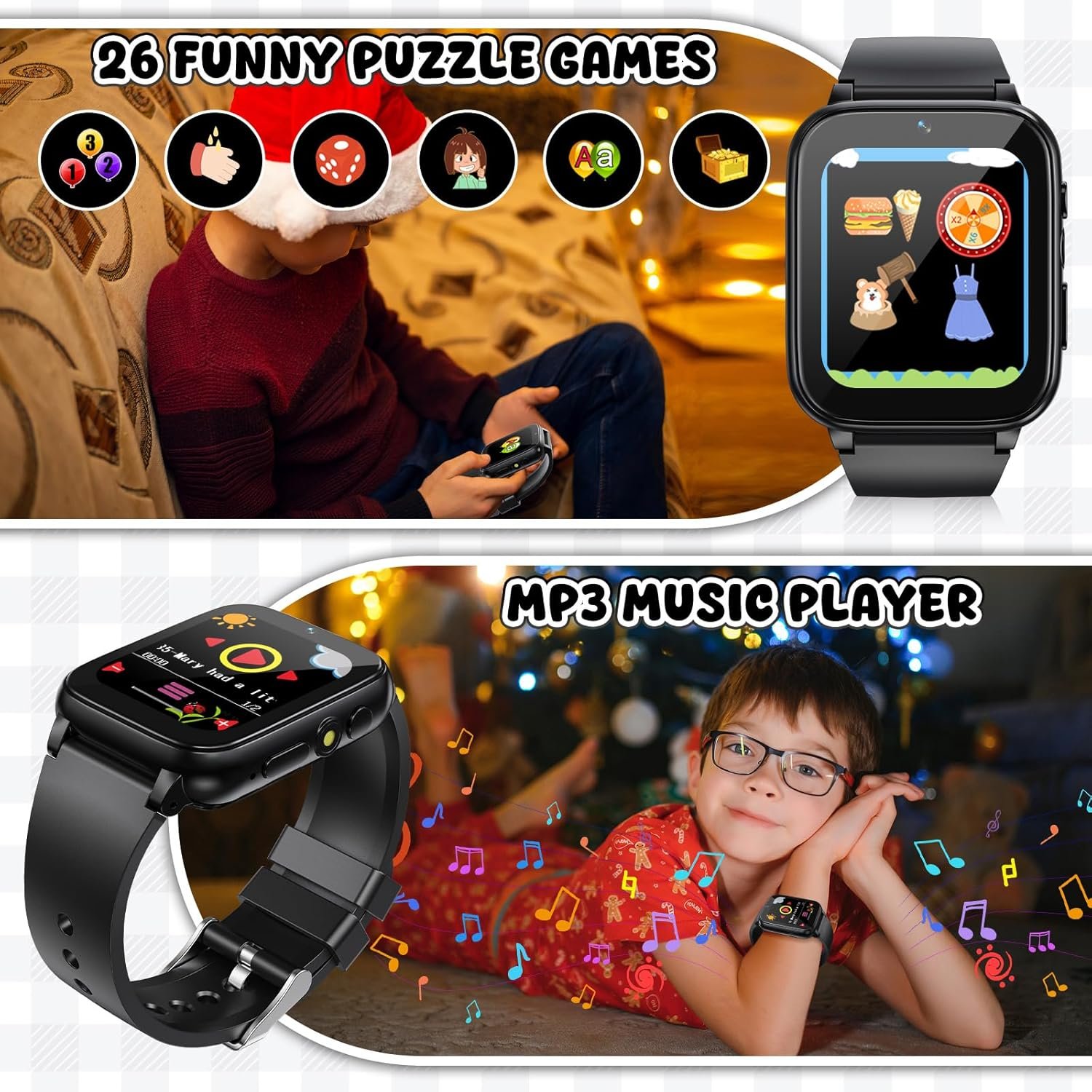 1.69” Kids Smart Watch,Boys Girls Smartwatch, Pedomter 26 Puzzle Games Camera Video Music Player Flashlight Alarm Clock,4-12 Years Children Birthday (Black)