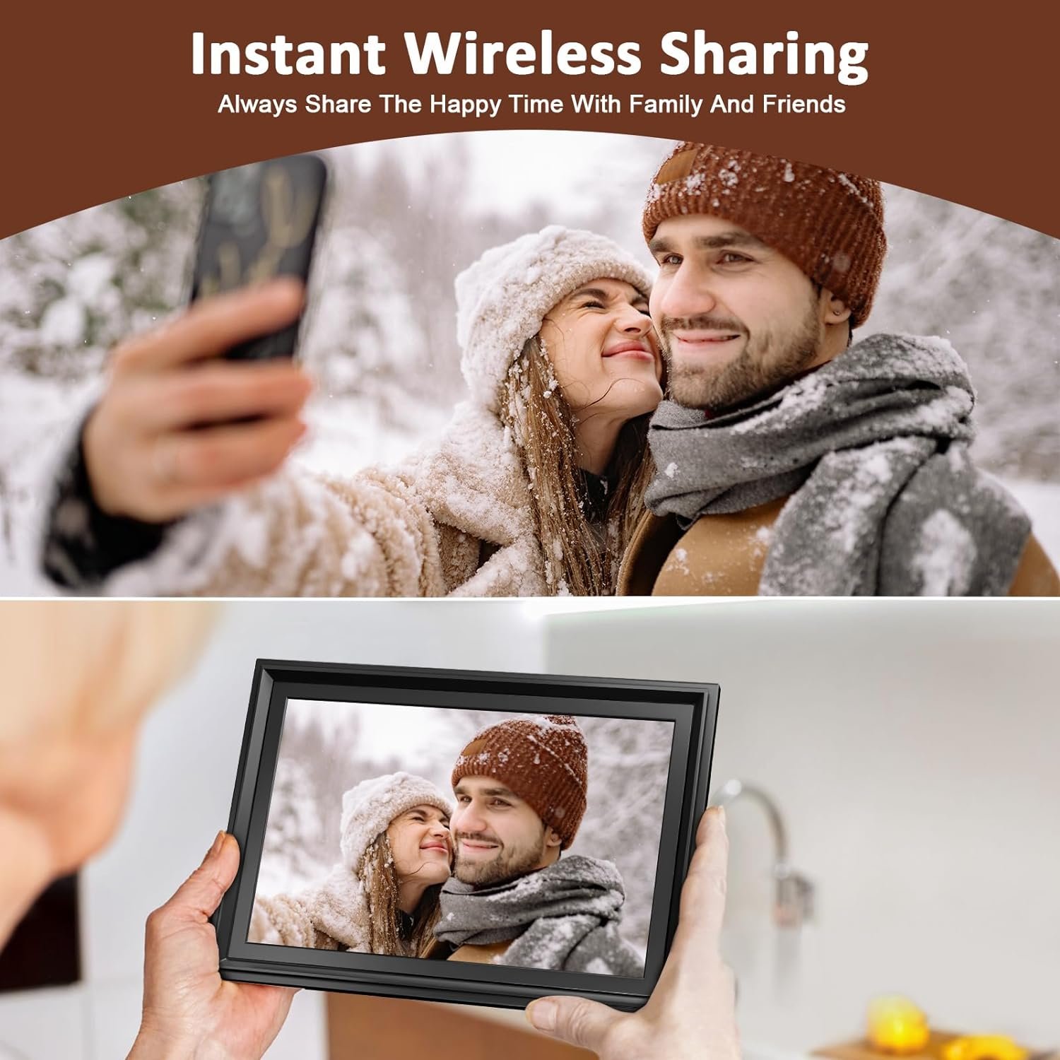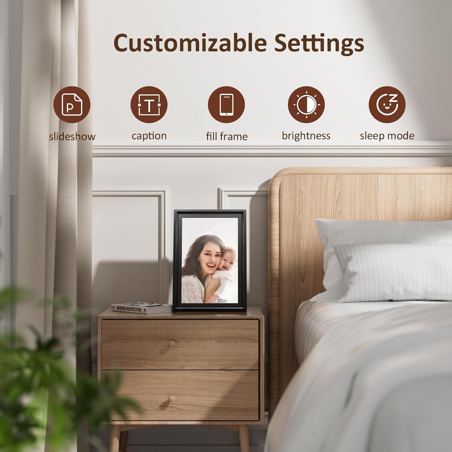 【Smart Function】The WiFi digital photo frame has functions such as zoom pictures, upload/withdraw pictures, adjust brightness, slideshow, and more. The smart digital photo frame compatible with WiFi and Bluetooth allows you to share every happy and warm moment anytime, anywhere.