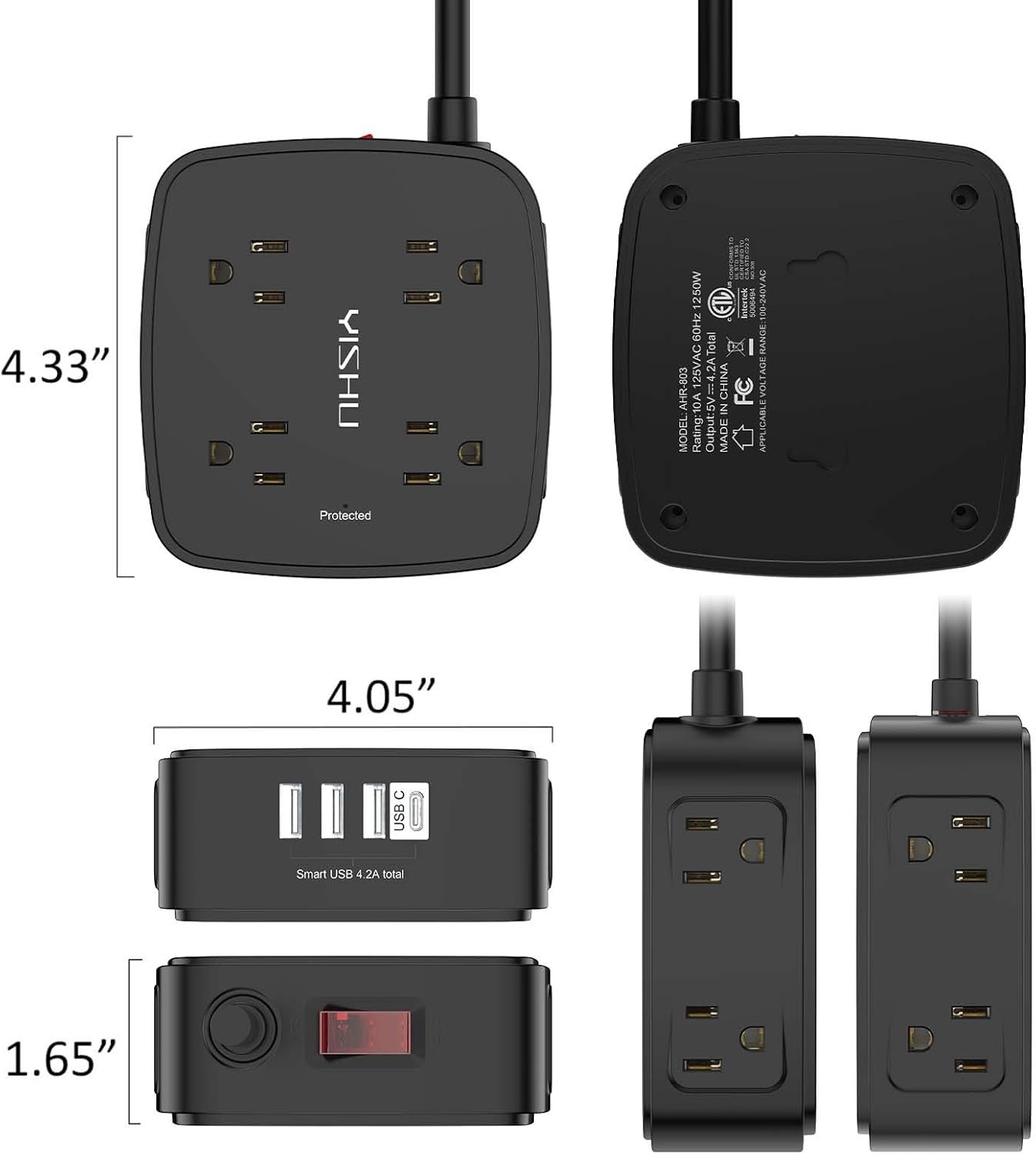 8 AC Outlets Power Strip with 4 USB Ports:The 3-side power strip with 8 AC widely outlets and 4 USB Charging Ports(Total 5V/4.2A), Each USB A port features 5V/2.4A Max output. USB C Charging Port features 5V/3A MAX. can power up to 12 devices simultaneously.Wide range voltage design, can be used on 120v ~ 240v circuit.