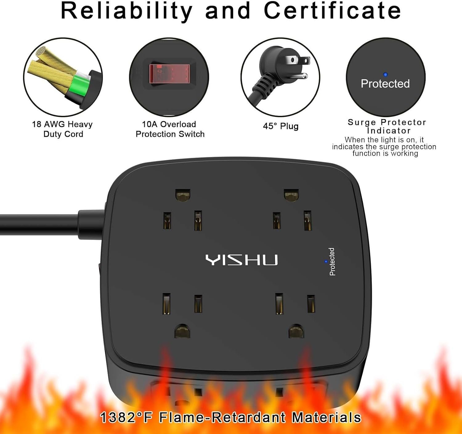 Multi Safety Protection:RoHS, FCC and ETL Certificates. This power strip has overload protection, short-circuit protection, over current protection, over-voltage protection and overheating protection. The surge protector with overload protection protects your electrical appliances from lighting, surges or spikes. The minimum energy-absorbing capacity of 600 Joules. It will automatically cut power to protect connected devices when voltage surge is overwhelming.
