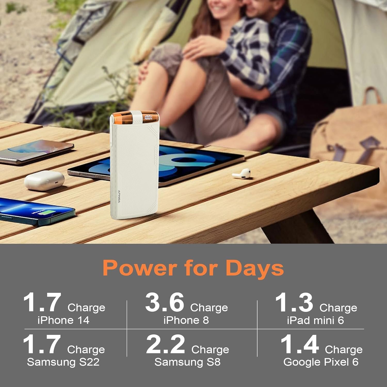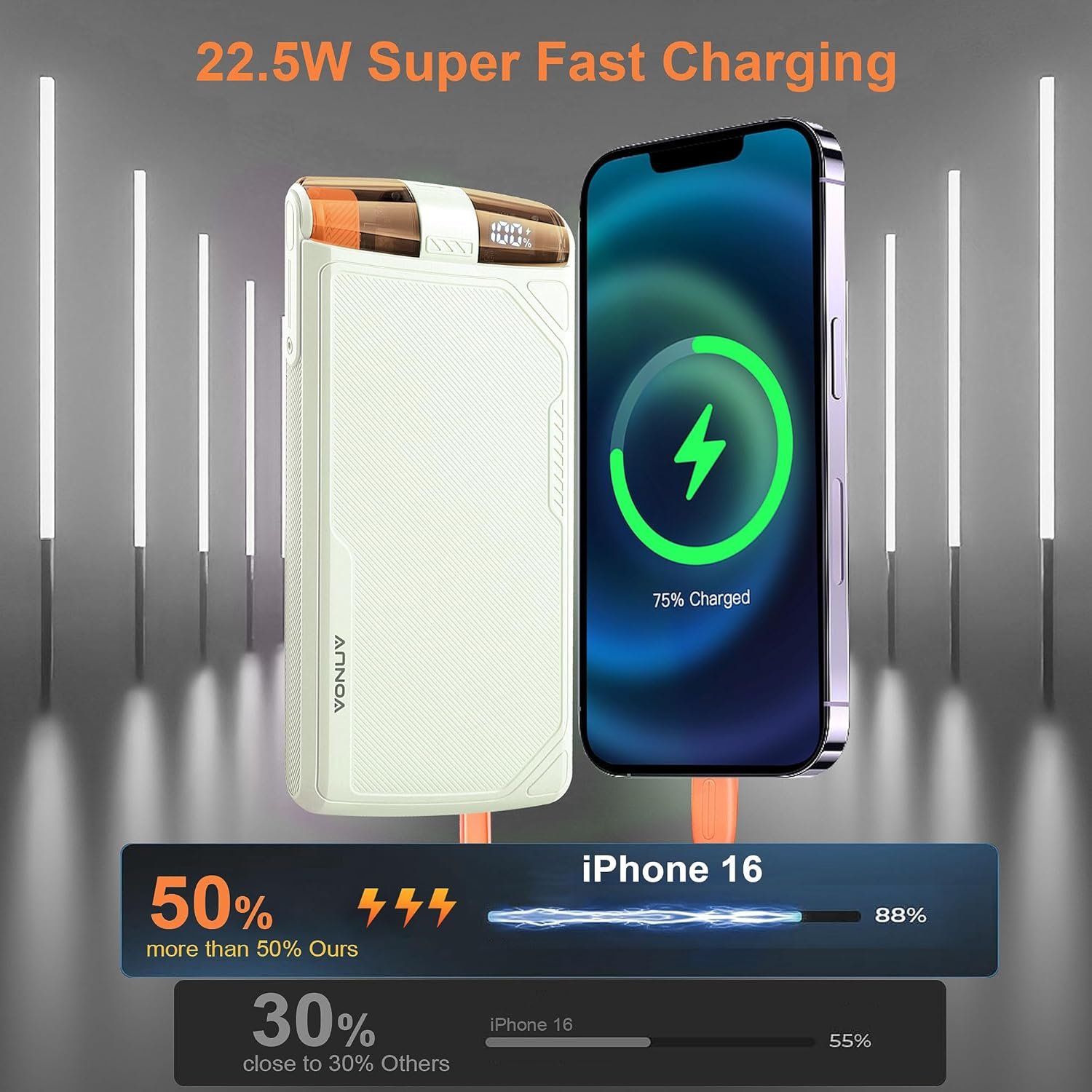Portable Charger with Built in Cables: Allowing you to charge up to two devices simultaneously. No need to carry extra cables or adapters, making it a hassle-free solution for on-the-go charging. Supports 20W PD and 22.5W USB-C output for fast, efficient charging of multiple devices.