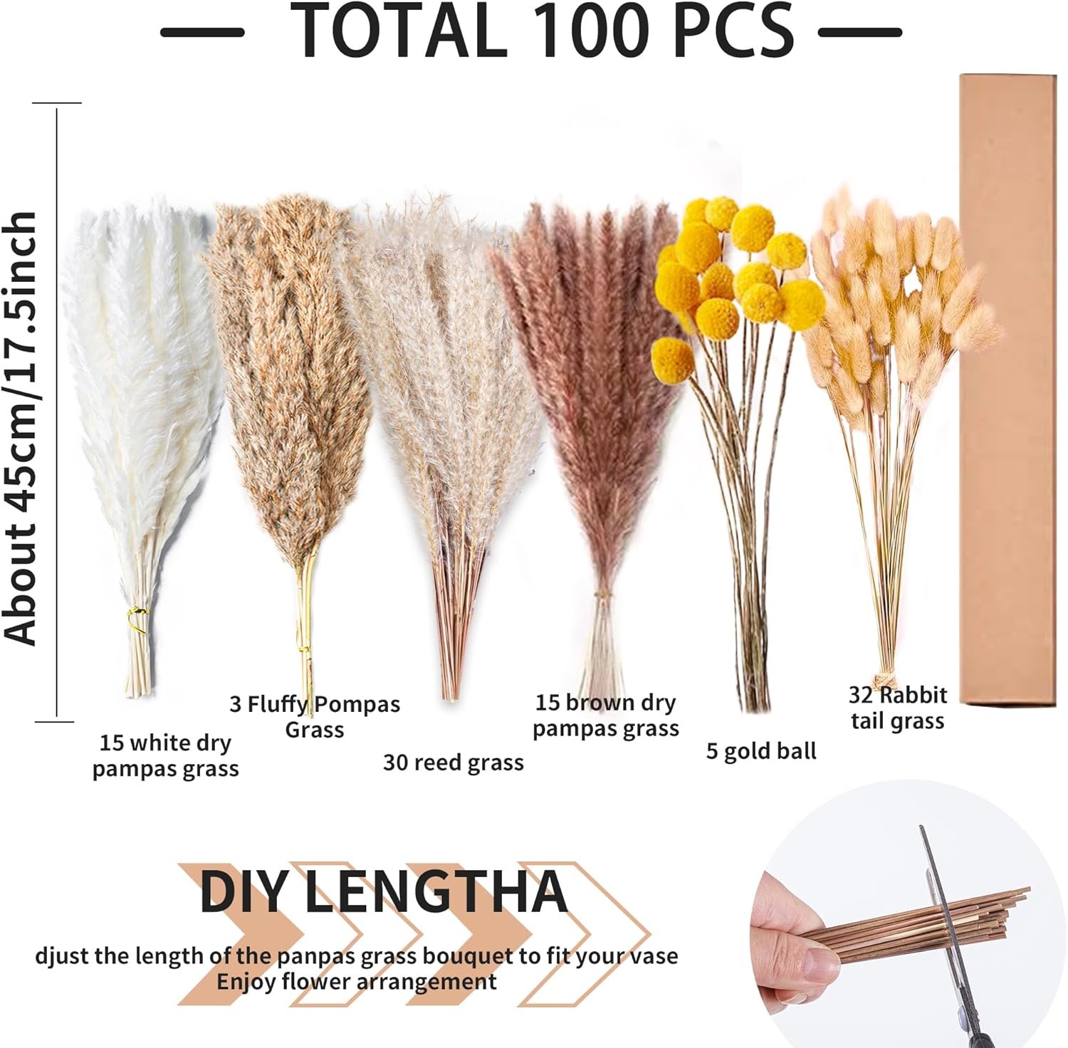 【MULTIPLE SCENES & QUANTITY】You will receive 100Pcs natural pampas grass, about 17.5 inches, including 15Pcs white dry pampas grass, 15Pcs brown dry pampas grass, 30Pcs reed grass, 32Pcs rabbit tail grass and 5Pcs gold ball,3Pcs Fluffy Pompas.