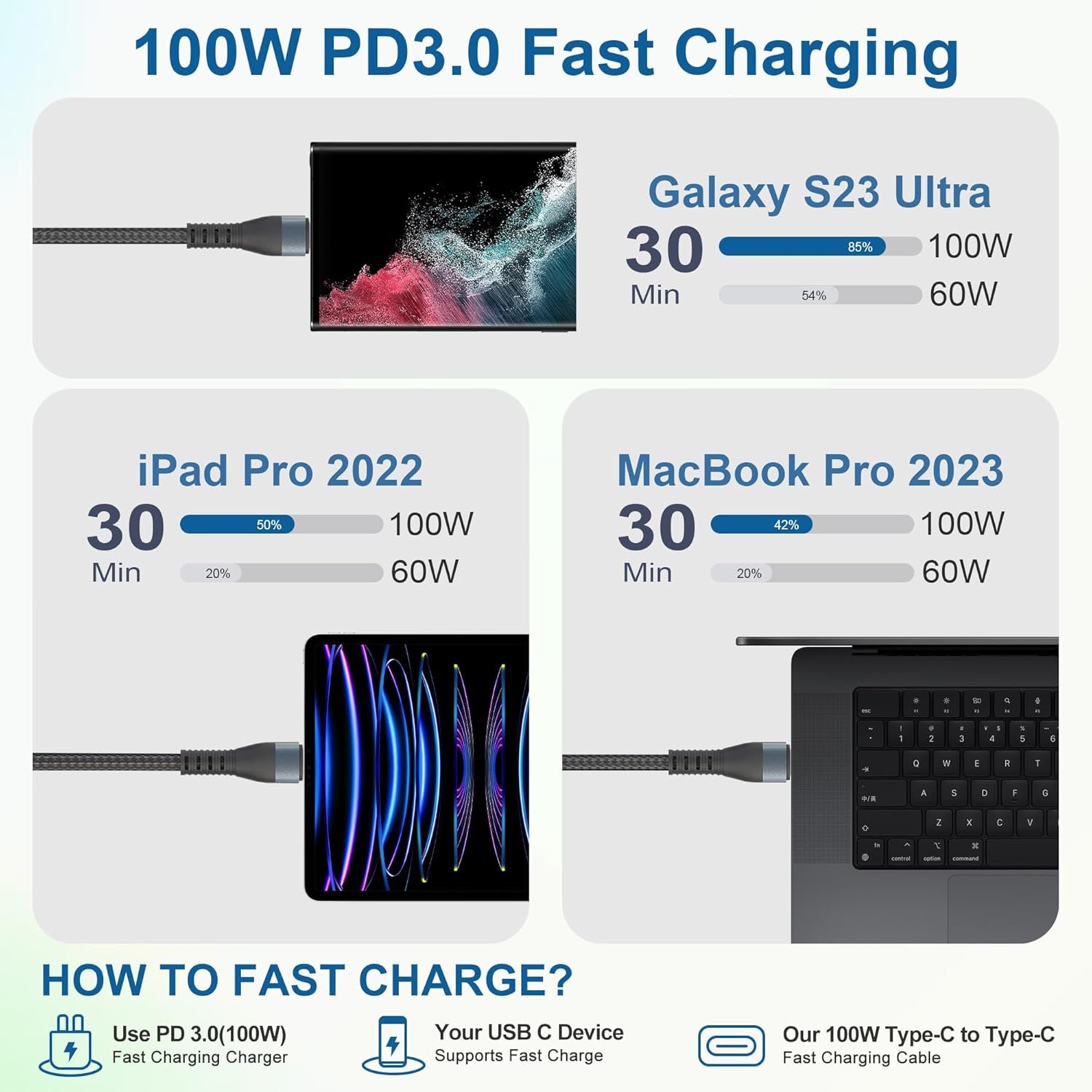 100W fast power delivery: Equipped with 6A 100W PD fast charging technology, Built-in independent chip, automatically detects the maximum power supported by the device and provides up to 6A (100W) available current as quickly as possible without damaging your mobile phone or PC device. Note: Actual charging speed depends on your device and wall charger.