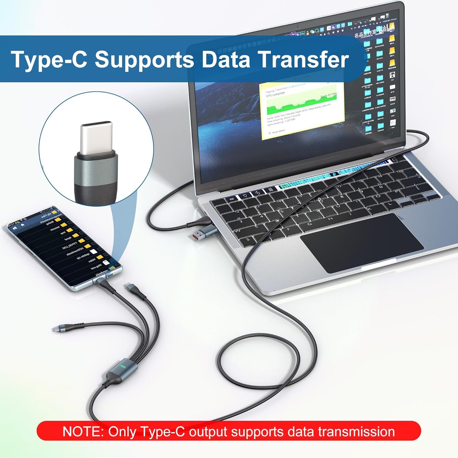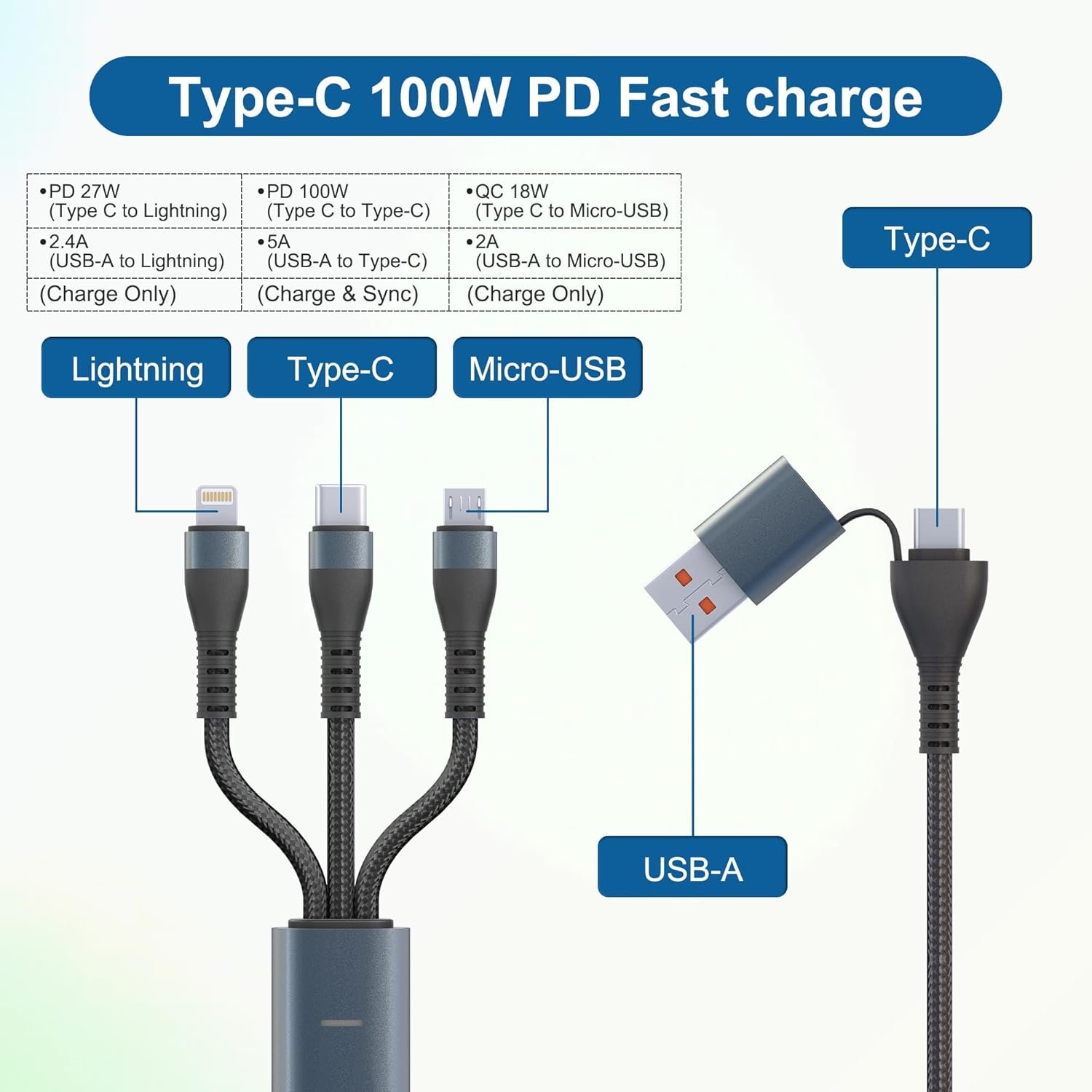 3-in-2 multi charger cable: The 100W multi USB cable has a 2-in-1 USB-A to USB-C port and 3 charging ports: Lightning/Type C/Micro-USB. 2-in-1 input is compatible with two types of chargers. Please note: *Only Type-C output supports 100W charging and 480Mbps data transfer, other outputs only support charging.