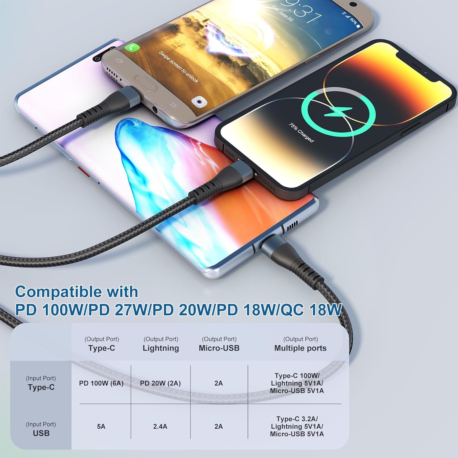 100W Multi Charging Cable with 3 Different Charging Ports: Micro USB, Lighting, USB-C