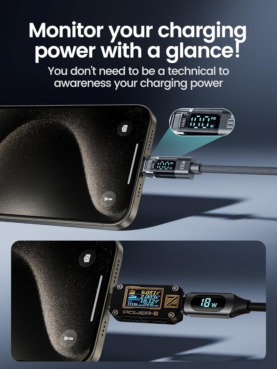 UNIQUE LED WATTAGE DISPLAY CABLE: With visual LED display design, it shows the real time wattage in charging. This type c charger fast charging cable can automatically identifies the voltage and current required by different electronic products (The maximum output power of the of the usb c pd cable is 100W, but the actual output power varies due to your charging devices and chargers)