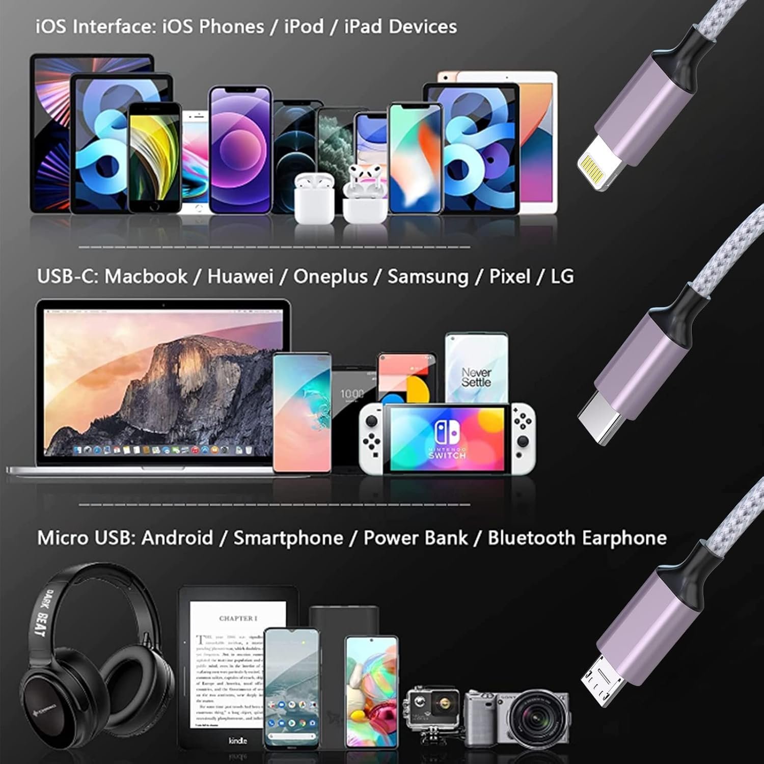 🔴【Universal Compatibility】The lightning/IOS port compatible with iPhone 13/13 Pro Max/12/12Pro/iPhone 11/11Pro/XS /XS Max/XR/8/8 Plus 7/7 Plus,Pad4,Pad Air,Pad mini. The USB C port supports to the Galaxy S10 S9 S8, Note 8, Nexus 5X, Nexus 6P, LG V30 V20 G6 G5, Pixel/Pixel 2 XL,HTC 10,OnePlus 2/3,Huawei.The Micro USB port compatible with Samsung Galaxy S7/S6/S4 most Android phones.The three interfaces are compatible with the vast majority of electronic devices on the market, so there is no need to worry about charging.