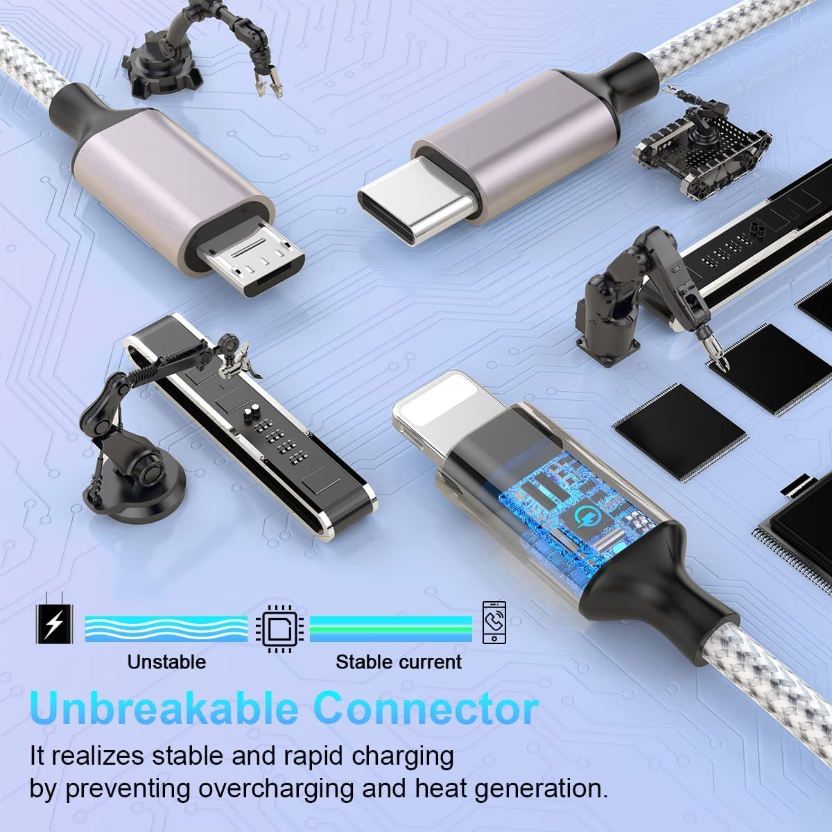 🔴【Durable & Flexible】The 5 in 1 usb multi charging cable is made of high quality metal and nylon and has been tested 10,000+ times for endurance and remains intact. Built-in four thick copper wires, packing more than 3A charging power and 480Mbps transmission speed, stable and efficient.