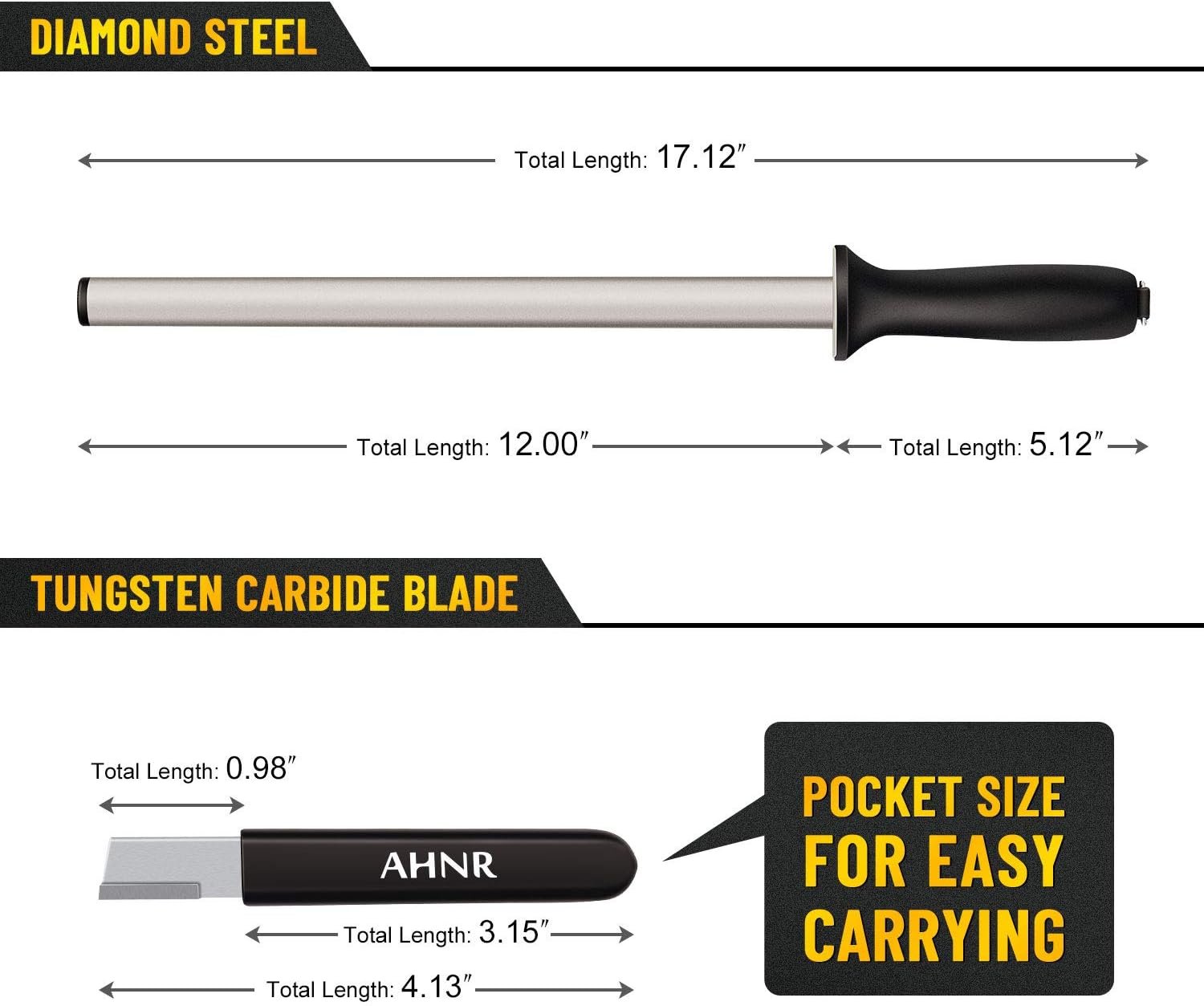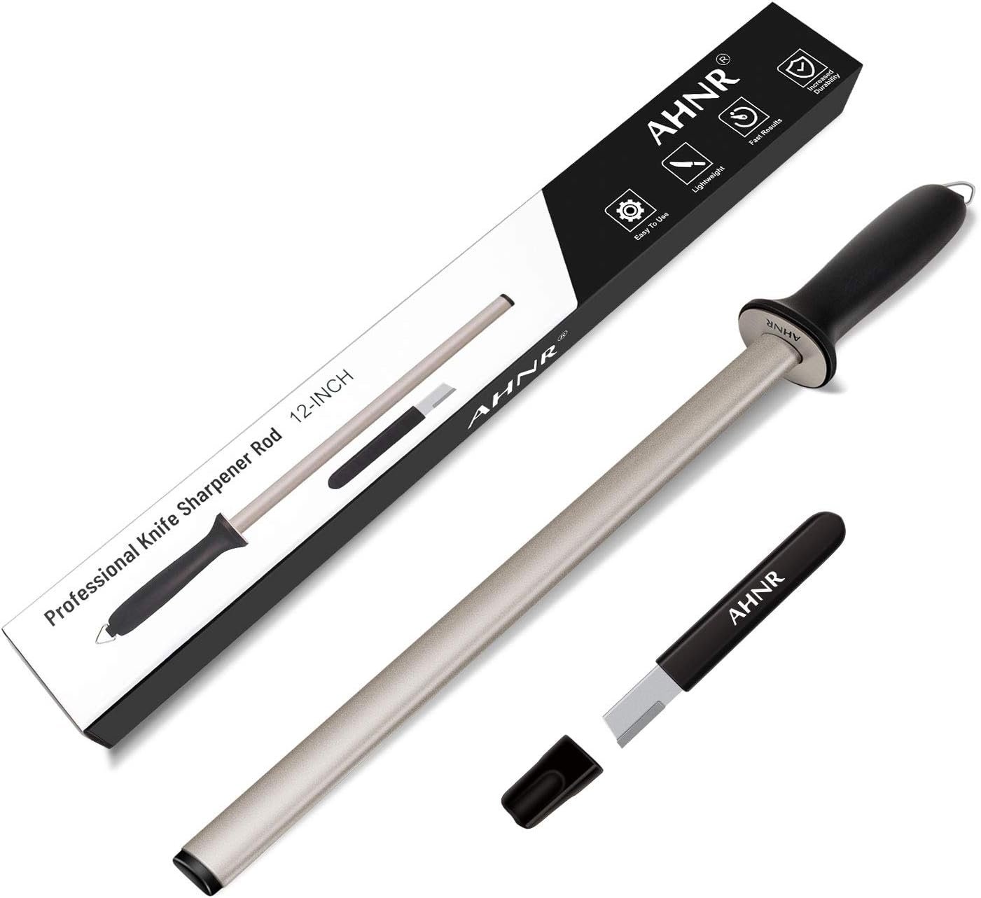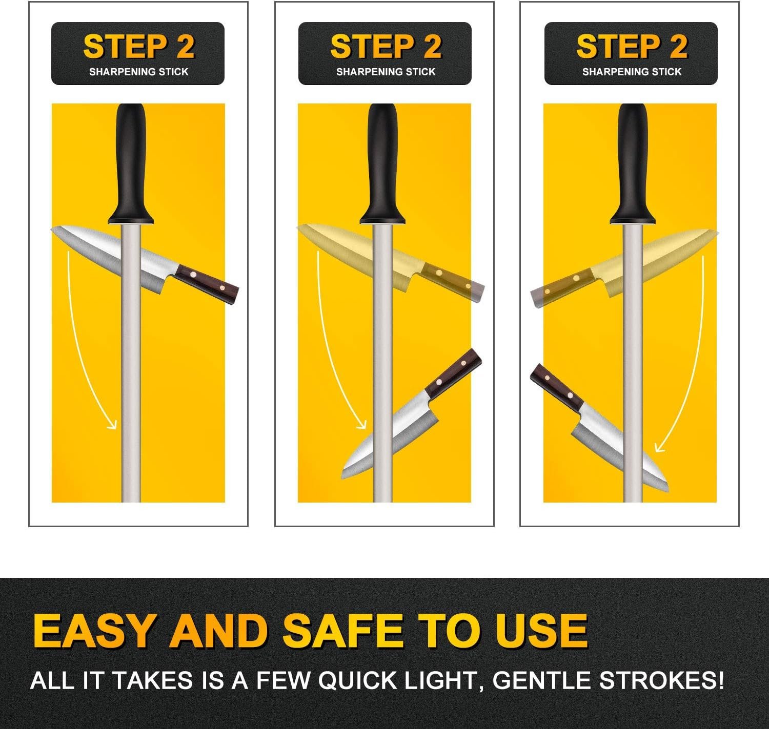 ➰【EASY & SAFE TO USE】 With a 12-inch honing steel, you’ll be able to use the vertical honing method with little risk of the knife hitting the work surface below. Ergonomic handle fits all hands, making it easy to use. The slip-resistant bottom durable handle will make the rod easy to handle and will stay in place while being used, so it becomes safer for you