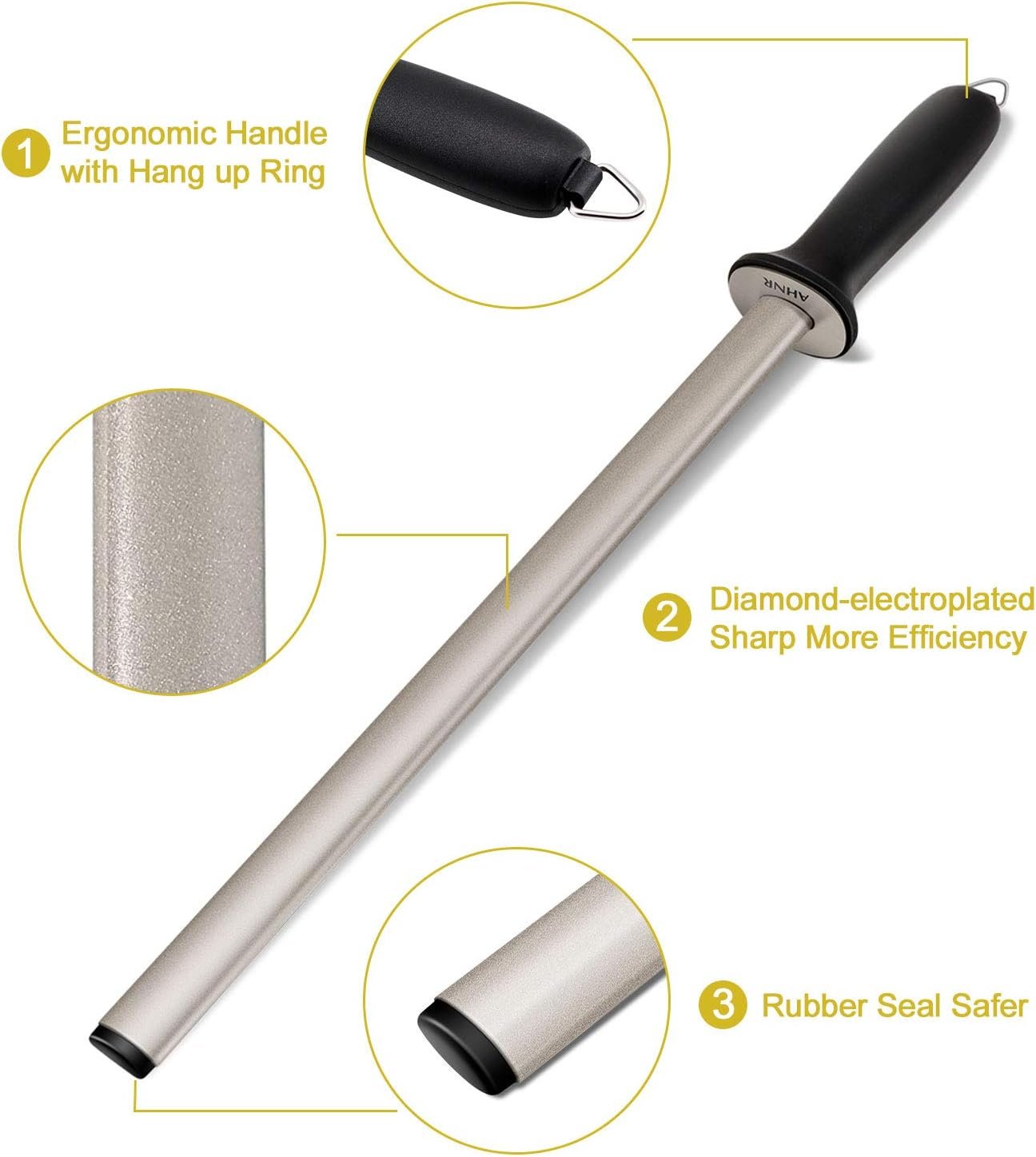 ➰【RETAINS MORE METAL ON YOUR KNIFE EDGE】The Honing steel sharpening rod is designed to be used often, it corrects the edge without shaving off much, if any, of the blade’s material. Its diamond coating gives kitchen knives an extremely fine sharpness when honed, quickly restoring their original cutting performance