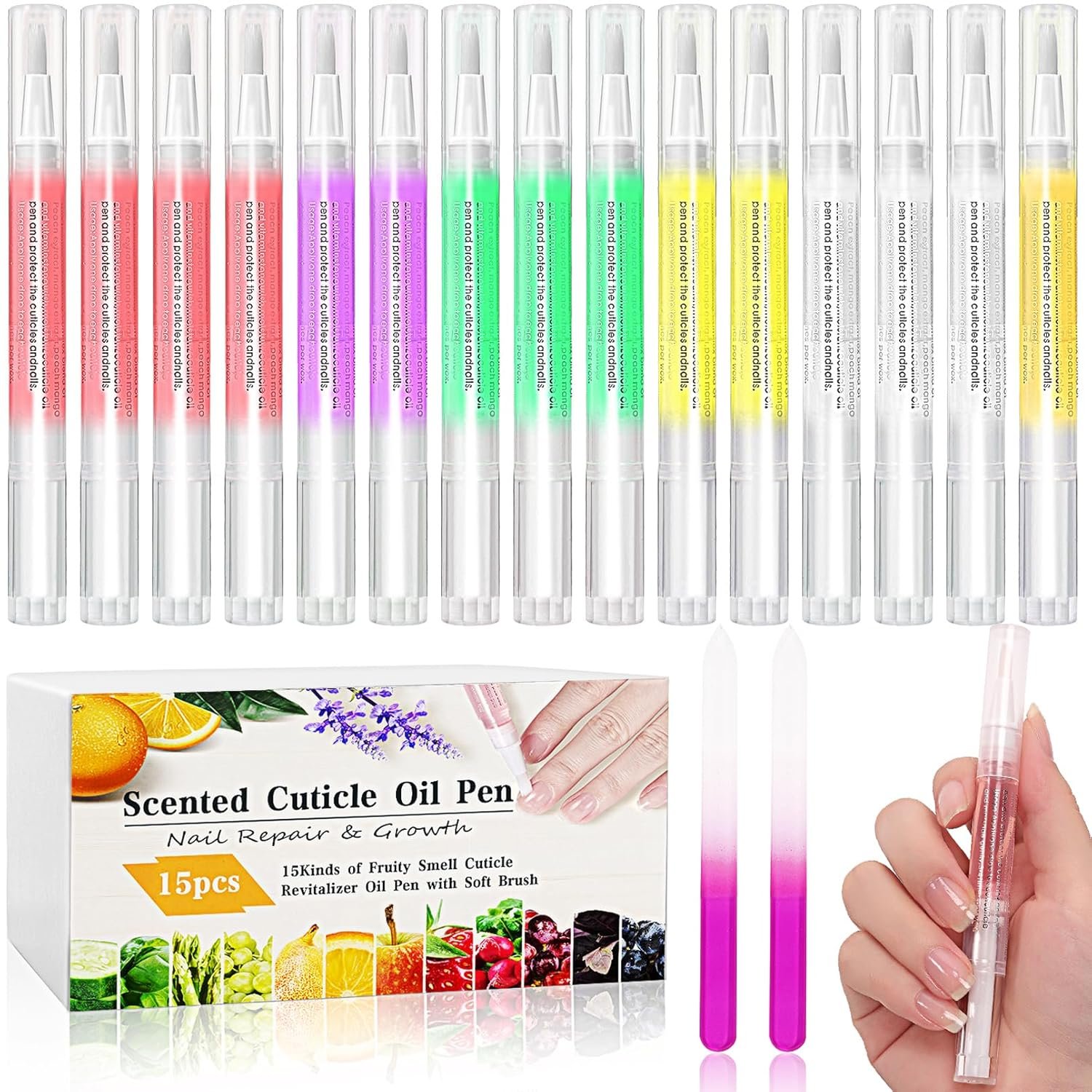 💝Cuticle Oil Pen Set: Nail Cuticle Oil Pen set included15 kinds of taste: Osmanthus, Lily, Lemon, Apple, Pineapple, Jasmine, Watermelon, Aloe, Blueberry, Cherry, Peach, Strawberry, Rose, Lavender, Orange. Sufficient quantity and variety of flavors, enough to meet your daily needs.