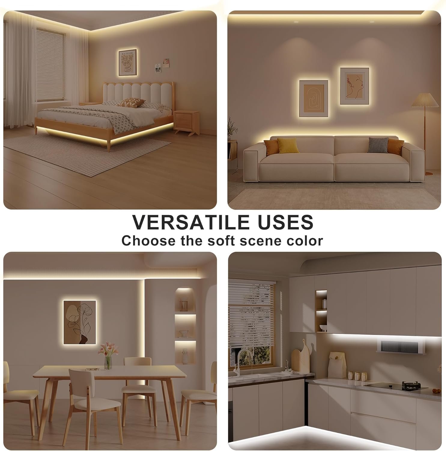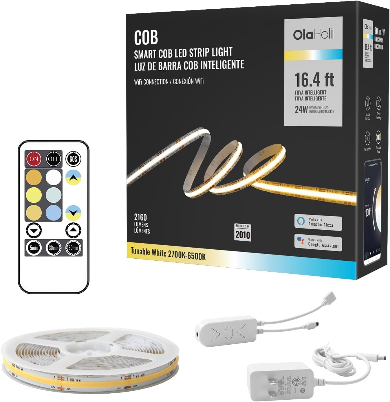 Enhance your living space with the Olaholii 16.4ft Smart Tunable White LED Strip Light. This versatile lighting solution allows you to adjust the color temperature from warm white to cool white (2700K-6500K), creating the perfect ambiance for any occasion. With smart voice control compatibility, you can effortlessly operate the LED strip light using Alexa or Google devices. Customize the brightness from 1% to 100% to suit your preferences, and enjoy the flexibility of bending and cutting the strip to fit your desired layout. Multiple control options, including a controller button, app, and IR remote, provide convenience at your fingertips.