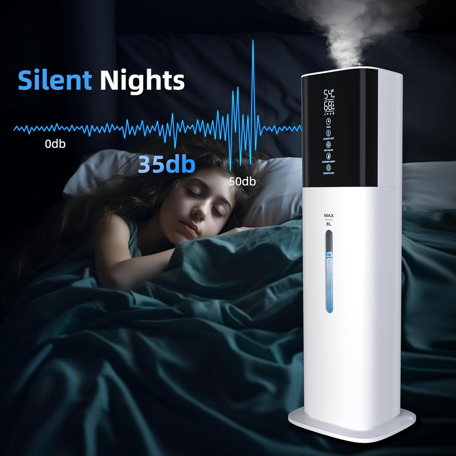 【8L Large Capacity & Powerful Mist!】This humidifier has a large 8L(2.11gal) water tank which can support a powerful mist output of 300ml/h for continuously up to 40 hours on a single refill. The humidifiers can satisfy 500 sq ft and is ideal for bedroom, office, plants, etc. The built-in stone ceramic filter enables it to work without any replacement filters. The long slim body can support us use it in any room in our house and won’t take up too many spaces!