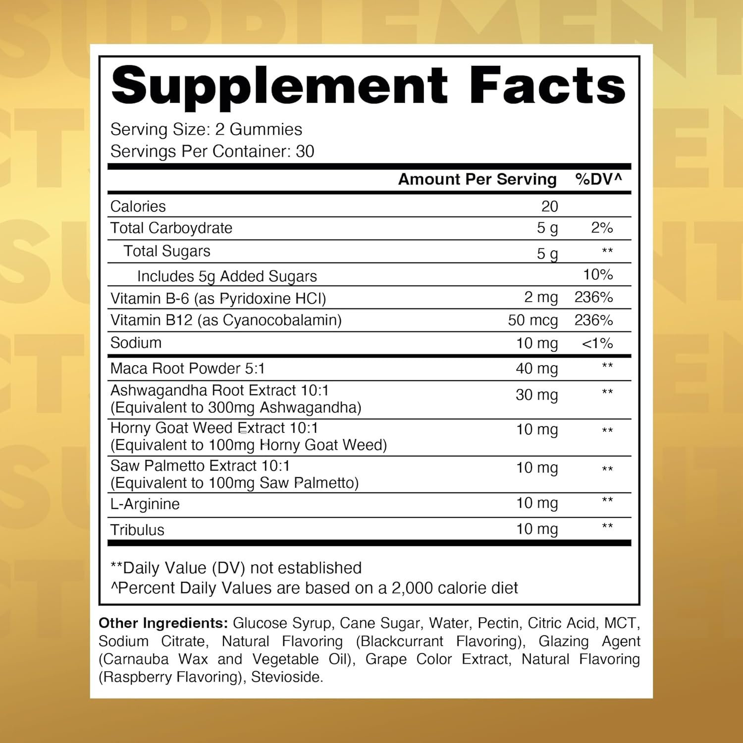 PREMIUM VALUE 2-PACK: Each bottle of our Testosterone Booster Gummies has 60 delicious gummies. Each serving has Vitamins B6 & Vitamins B12 along with Maca, Ashwagandha & more. This carefully crafted formula may help improve daily energy and muscle strength. That’s a total value of 120 gummies at just $24.99!