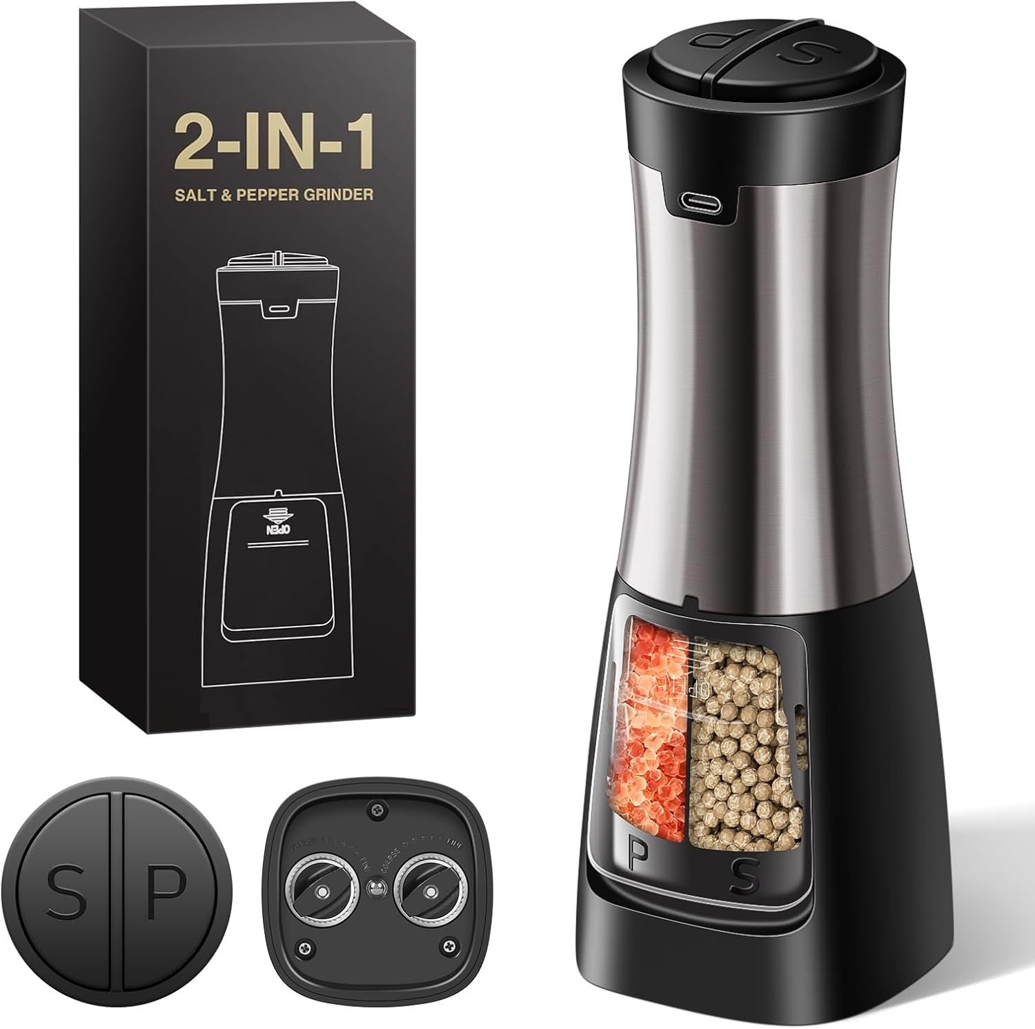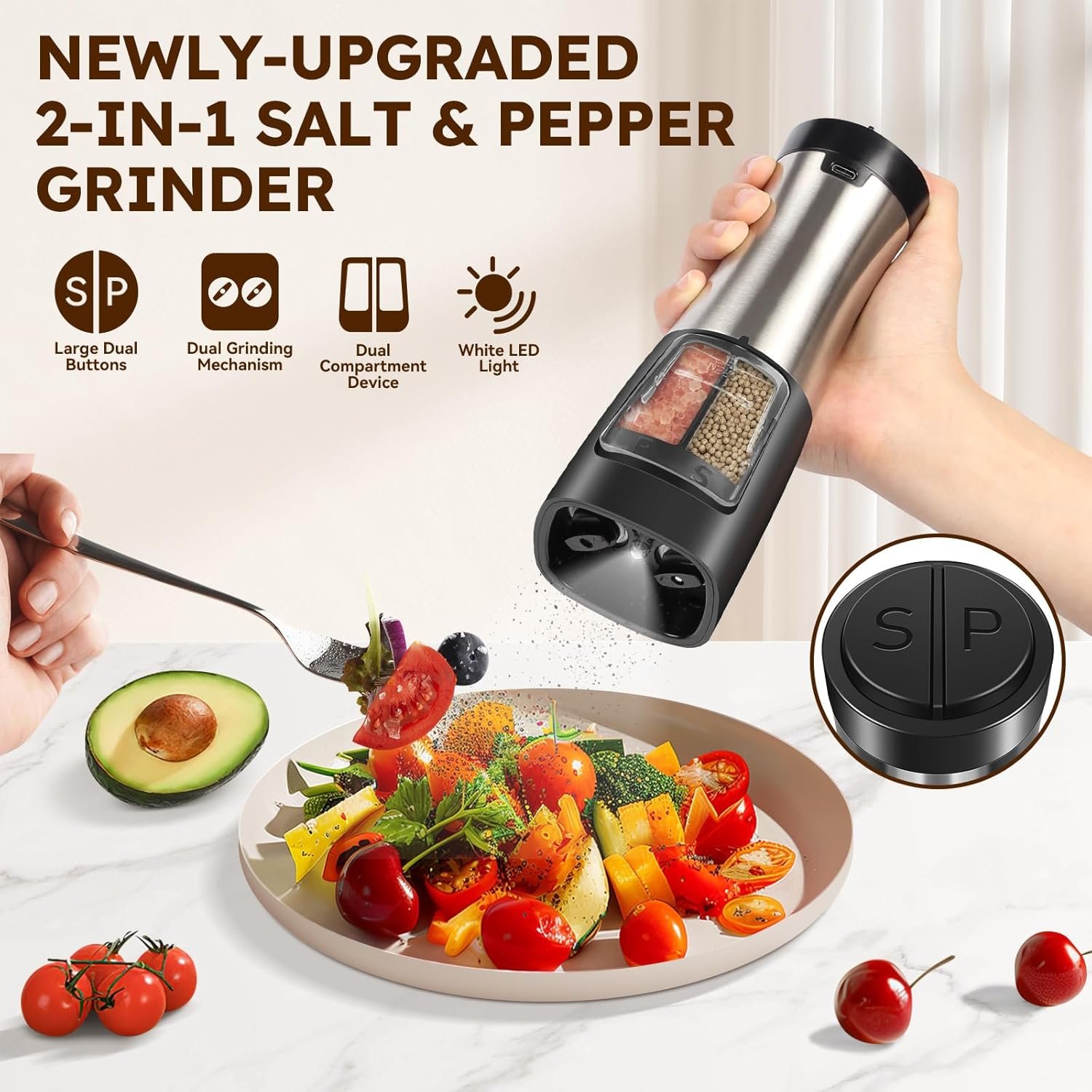 Introducing the new-upgraded 2-in-1 Salt & Pepper Grinder, designed for convenience and style in your kitchen. Featuring dual oversized buttons for easy use, independent grinding cores for consistent results, and dual bins to keep your salt and pepper separate. The sleek design also includes a white LED light to ensure perfect seasoning every time. Make your culinary experience more enjoyable with this all-in-one solution for seasoning.