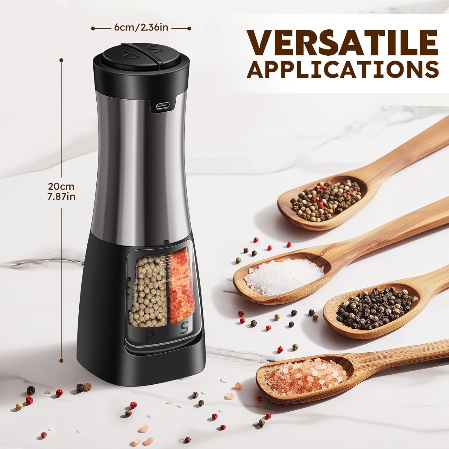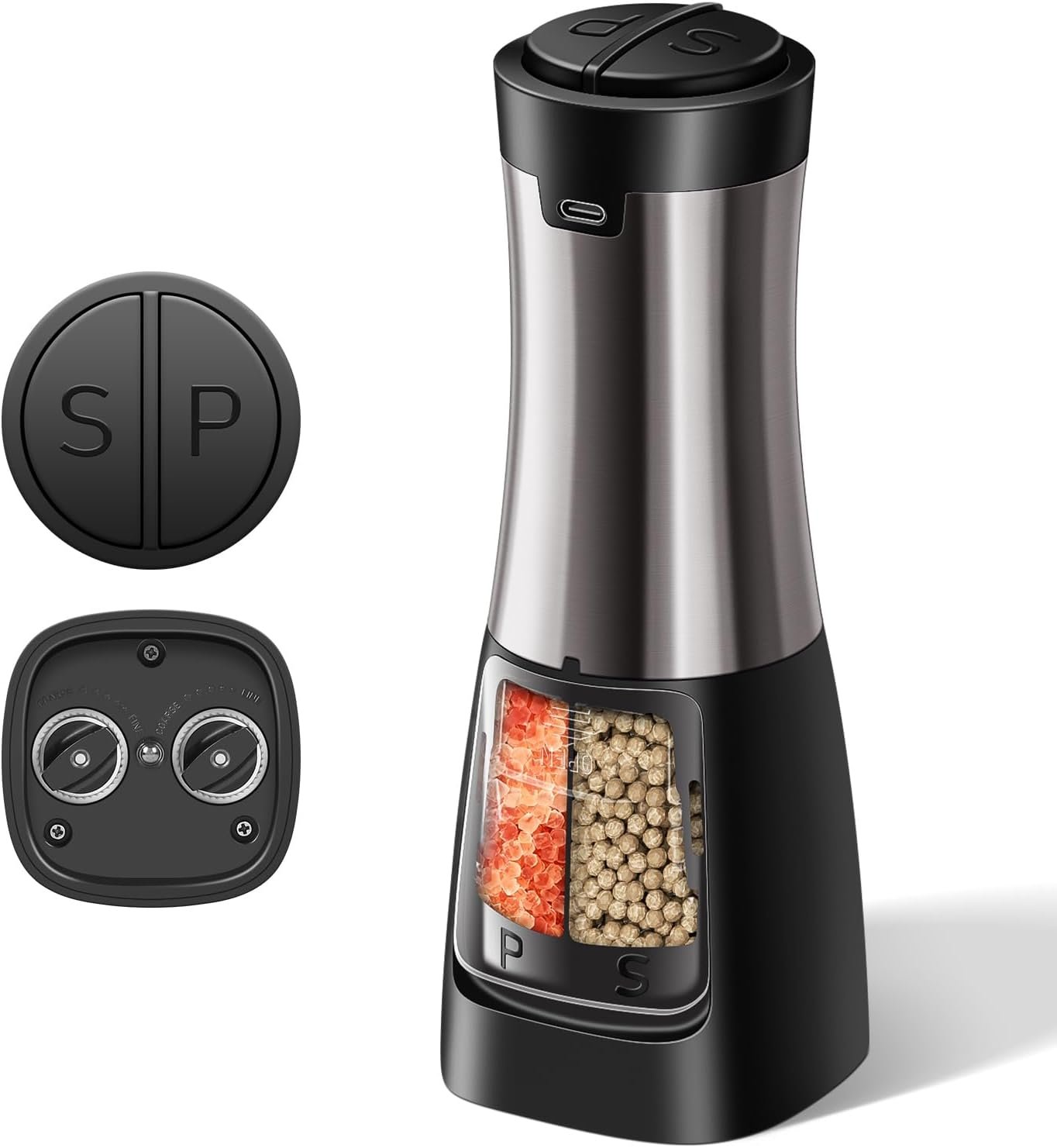 ★ UPGRADED USB-C RECHARGEABLE 2-IN-1: Featuring dual ceramic grinders, dual silos, and dual large buttons, the Crosphere 2-in-1 electric salt and pepper grinder set shakers electric is USB-C rechargeable and requires no batteries! This electric grinder set rechargeable combines a salt grinder and a pepper grinder in one ergonomic, one-handed operation design, saving time, improving efficiency, and conserving energy and space. Whether indoors or outdoors, you can enhance your cooking experience with the touch of a button.