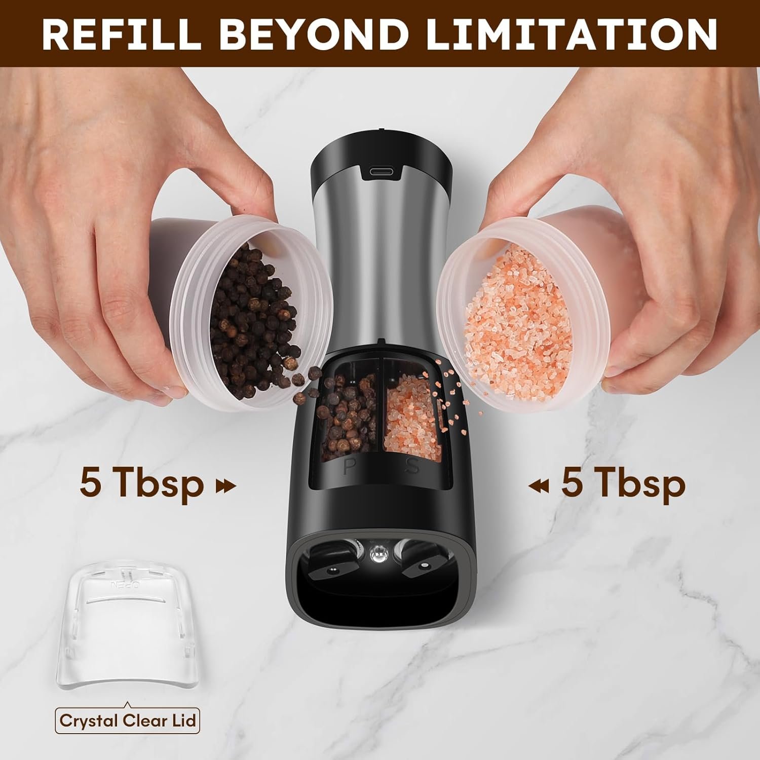 Effortlessly Season Your Dishes with the Upgraded 2-in-1 Salt & Pepper Grinder.