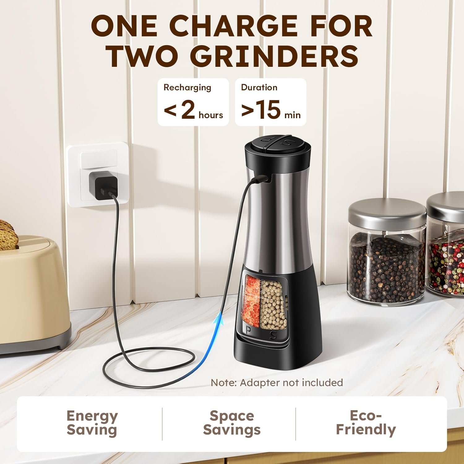 Charge once, season twice! This 2-in-1 salt and pepper grinder features a rechargeable design, giving you the power of two grinders in a single, sleek device. With a quick recharge time of under 2 hours, you’ll enjoy over 15 minutes of continuous use—perfect for all your culinary adventures. No need to worry about changing batteries, just plug in, charge up, and elevate your cooking game effortlessly.