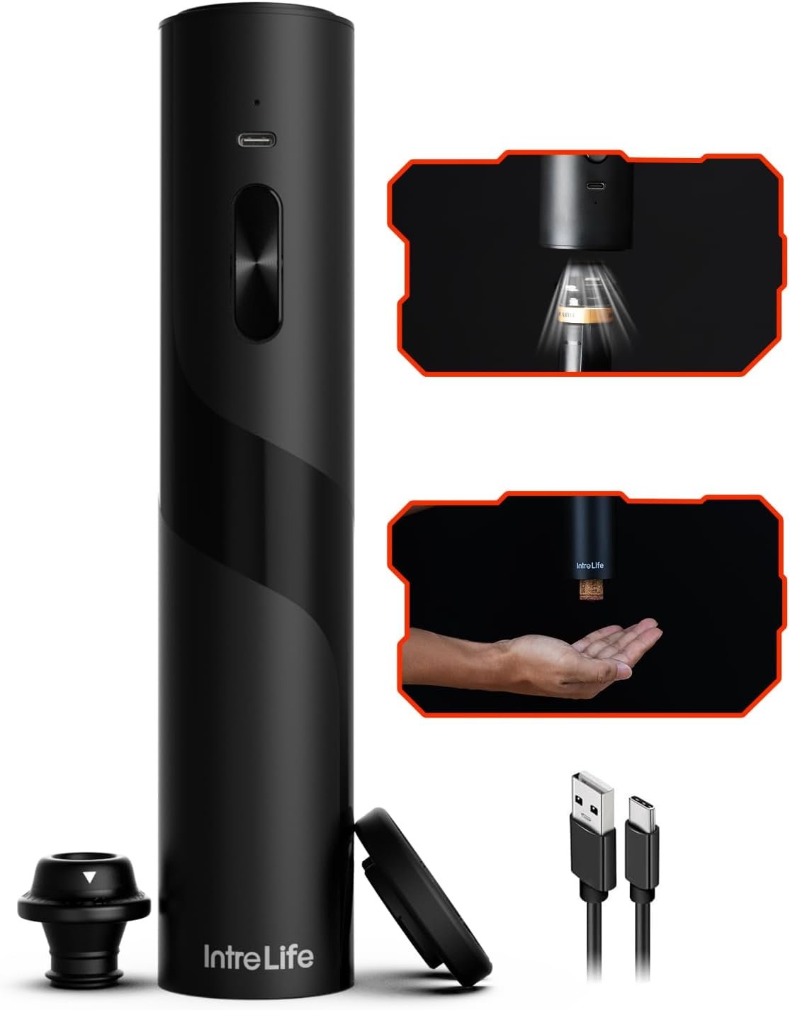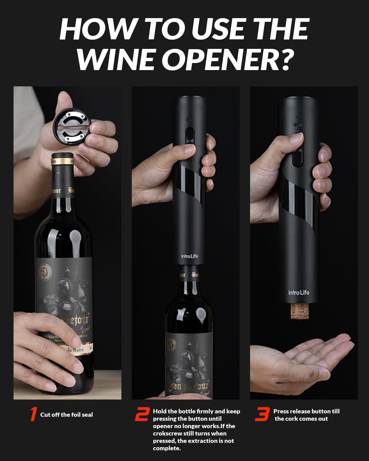 ⚡Easy,Safe and Efficient Wine Opener⚡Take out the foil cutter to easily remove bottle seals.Place the wine opener on top of the bottle to remove the cork with a simple push of a button.No worries of pulling, twisting, or breaking the cork in pieces. The cork is neither broken nor cracked. Unlike wine key,waiter corkscrew,wing corkscrew or air pressure pump bottle opener,it’s more effortless than any manual corkscrew wine bottle opener. A real easy screw out tool.