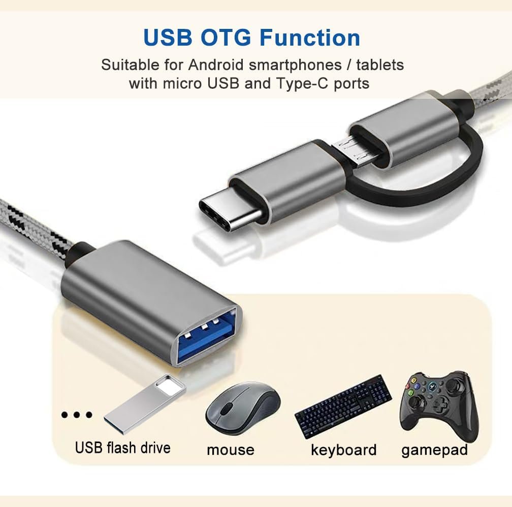 About this productDual interface design, The USB adapter cable suitable for Android as well as TYPE-C interface. 2-in-1 usb c to usb adapter cable converts from USB-C to USB-ACompatible DevicesThe USB C and Micro USB to USB adapter is compatible with most smartphones, tablets and laptops with USB C or Micro USB ports, such as Samsung Galaxy S7/S8/S9/S10/S20/S21/S22/Note 20/A53, Google Pixel, MacBook Pro/Air, HUAWEI and more.
