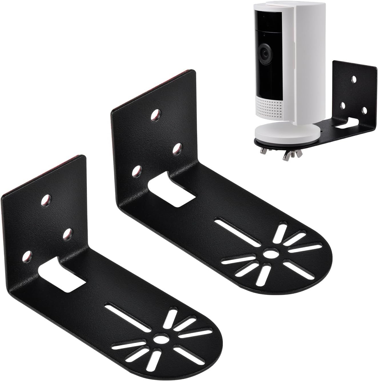 【Two way installation methods】: This L-shape metal camera mount can be fixed with screws or adhesive according to your installation needs, Please make sure the wall is smooth and flat if using self-adhesive tape mounting and wait at least 6 hours to install the Ring Indoor Cam to make the tape closely attach to the desired surface,So this bracket can be easily installed by anyone.