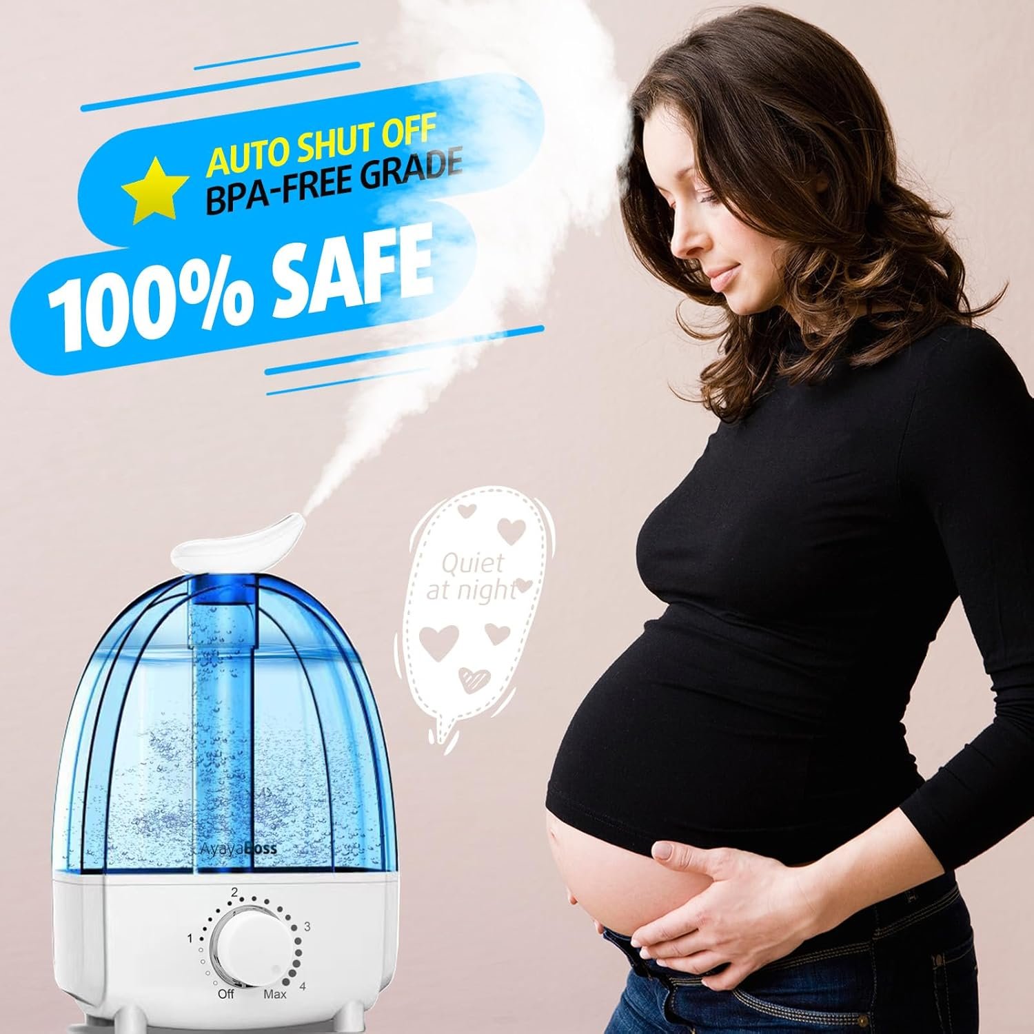 Ultrasonic humidifier works quietly, ensuring a peaceful environment while you rest. The ergonomic design with 360-degree rotary nozzle can adjust the mist flow to a perfect spot.