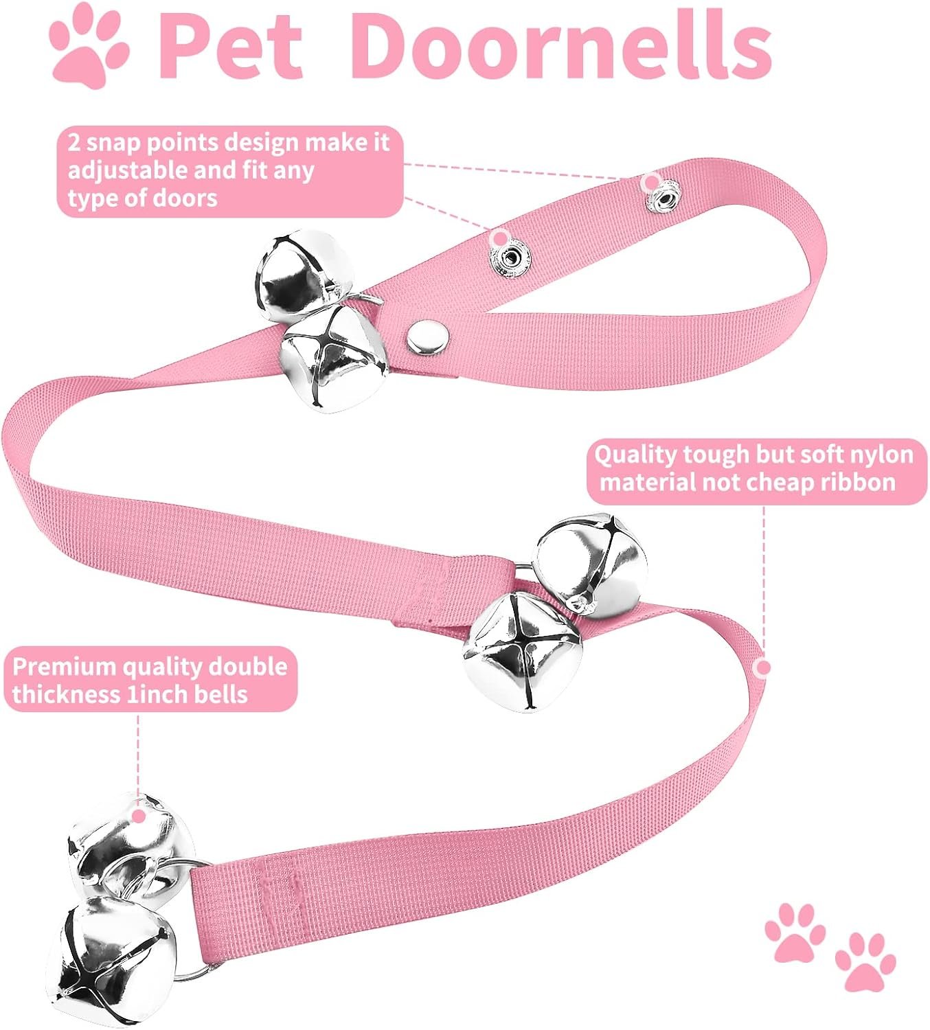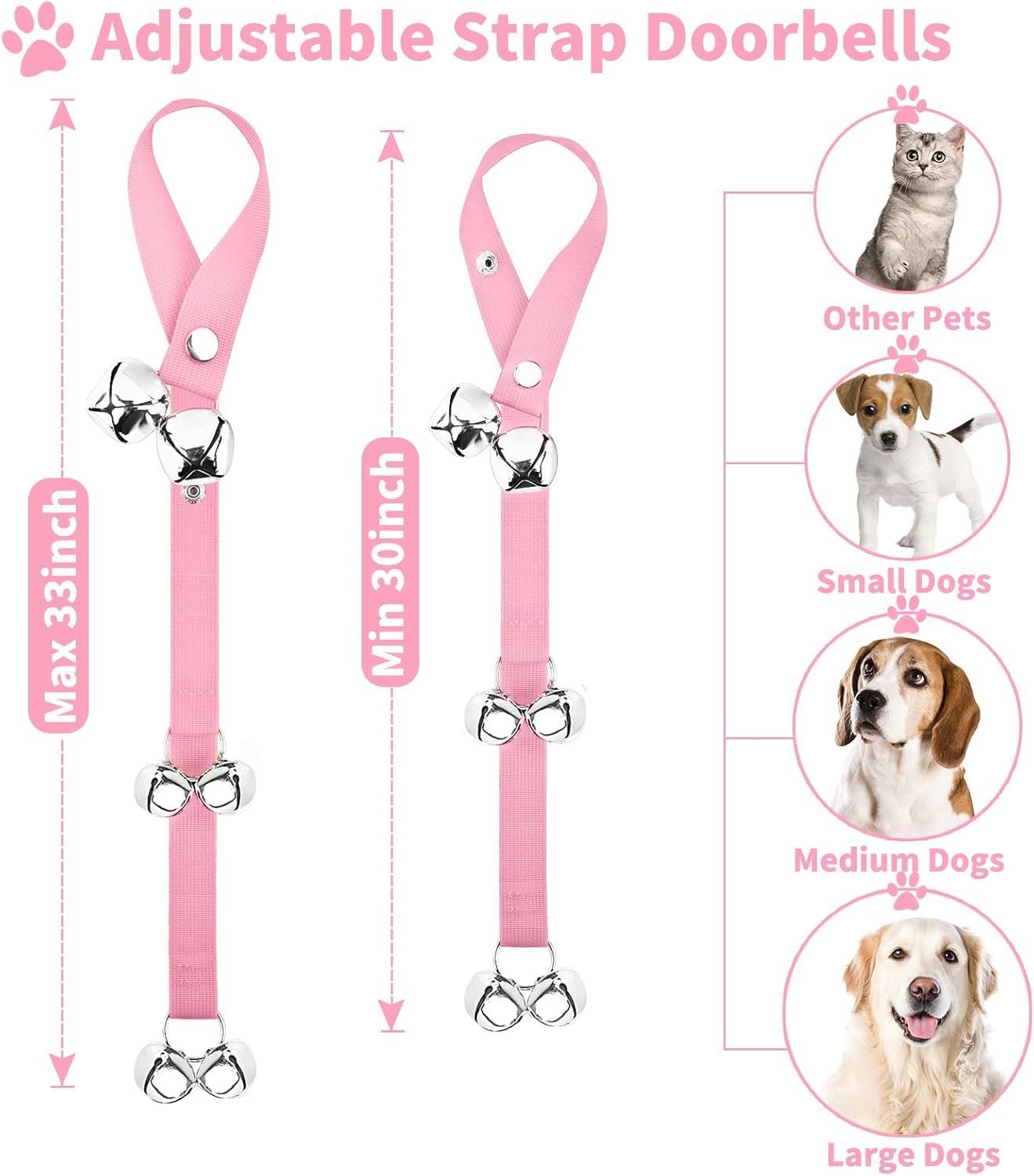🔔 Adjustable Length: Our dog doorbell comes with snaps, easily adjusting the length between 30″” and 33″”. Works on different kind of doorknob, handle or hook that you want to affix it to. Easily mounted, can be hung at any level to accommodate pups of all heights.