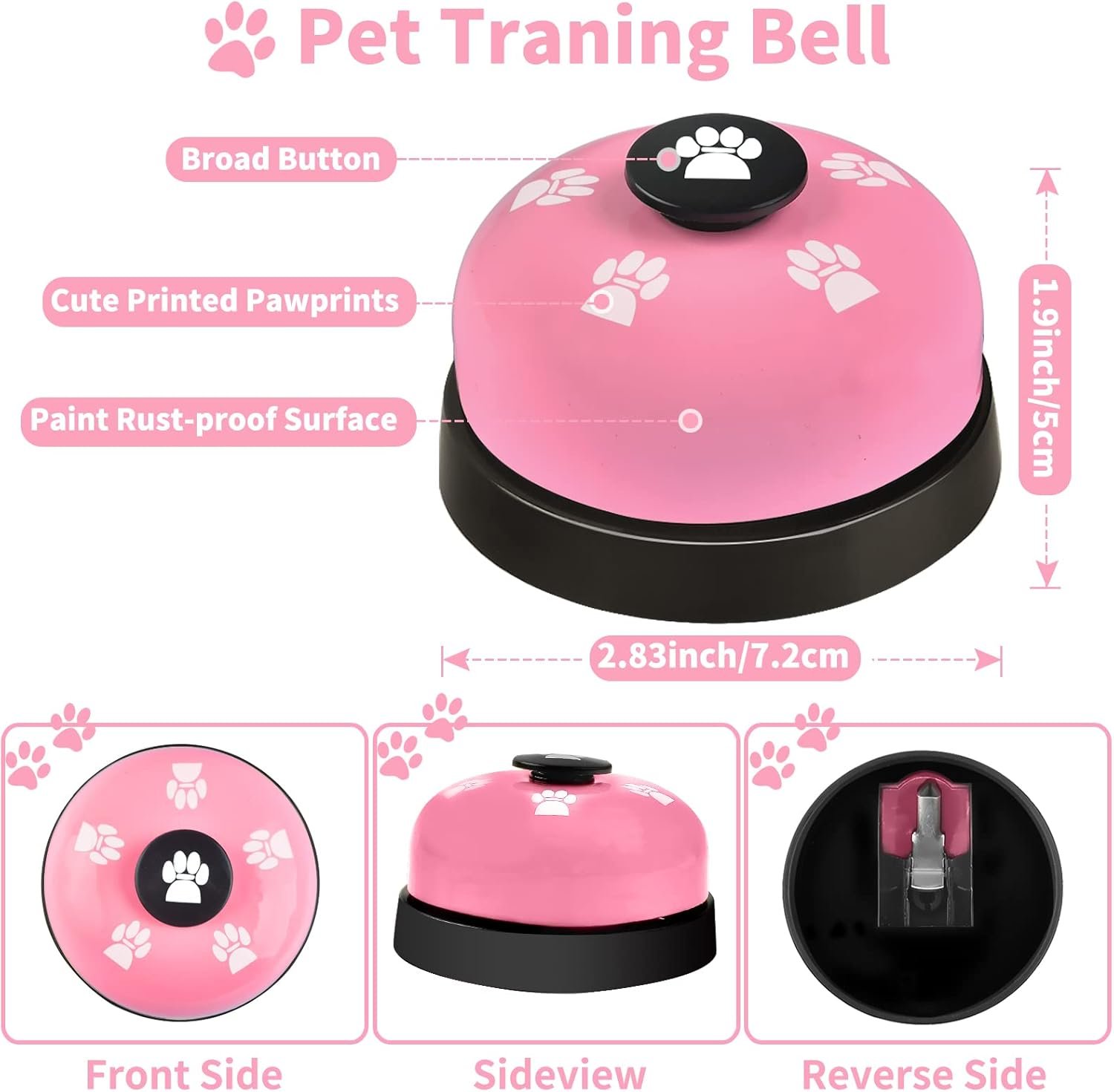 🔔 Great for Dogs and Cats: This palm size pet training with diameter 2.83 inch/7.2 cm. Teach your pet baby, dog, kitten or others to hit the middle button with their paw or nose to ring, which is easily done by even by small pet.