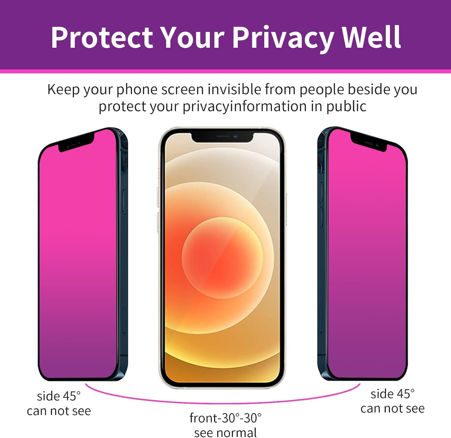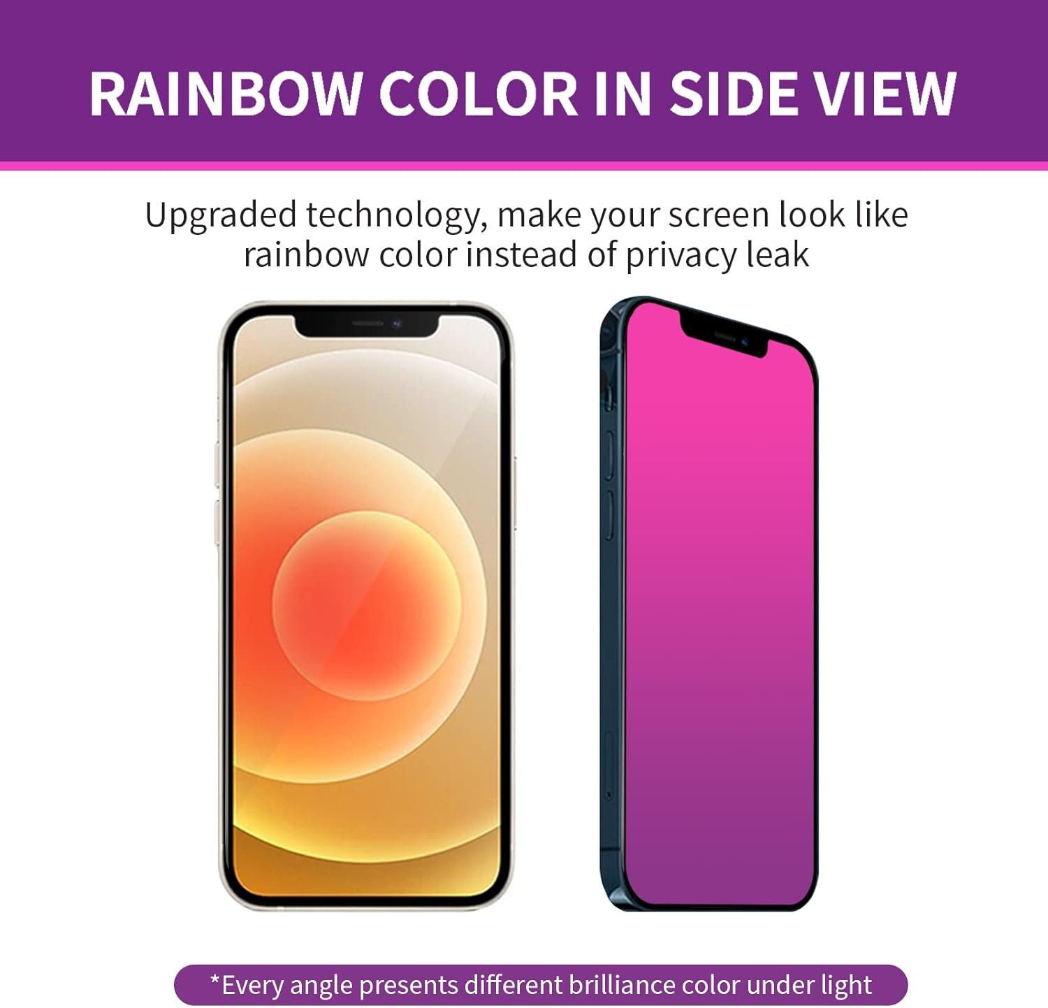 [Gradient Colorful Anti-Spy Screen Protection] Different from the normal black privacy screen protector, it brings different glitter purple-rose gradient rainbow colors from different viewing angles under the light. Choose the most appropriate color depth for the anti-peep coating, it is only visible to persons directly in front of screen, while satisfying privacy and visual comfort. Hides your private and sensitive information from strangers in the bus, elevator, metro or other public places.