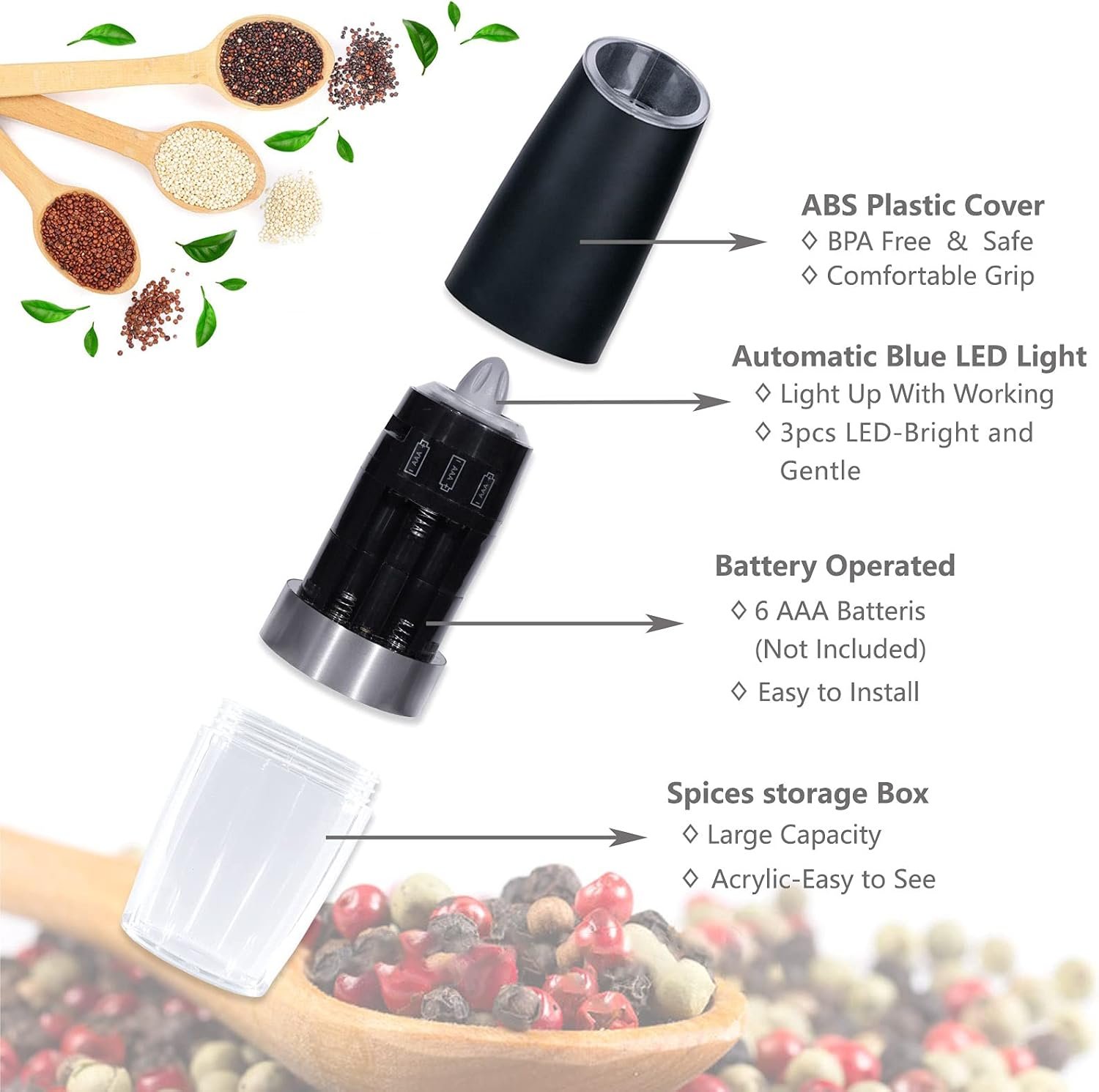 【Unique Design】Transparent acrylic material at the bottom allows you to see the remaining spices and convenient to distinguish the spices in the grinder. With the blue LED light, blue light is not only bright but also gentle, you can easily to see amount of pepper, salt and other grain you put in your food.