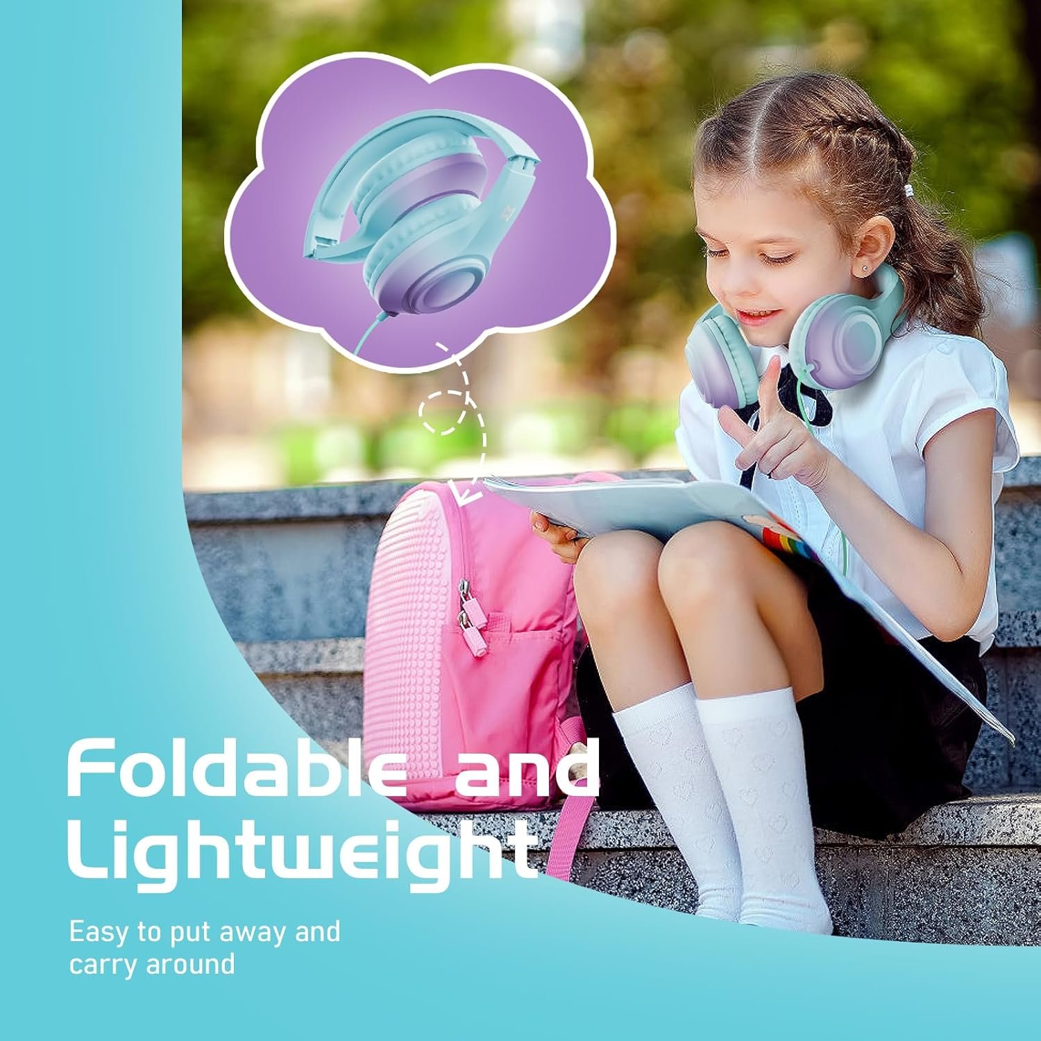【Super Lightweight and Easy to Fold】Lightweight design won’t put pressure on your child’s head. Foldable design makes these kids headphones easy to transport and store for school or road trips; simply fold the headphones, coil up the wire, and put them away.