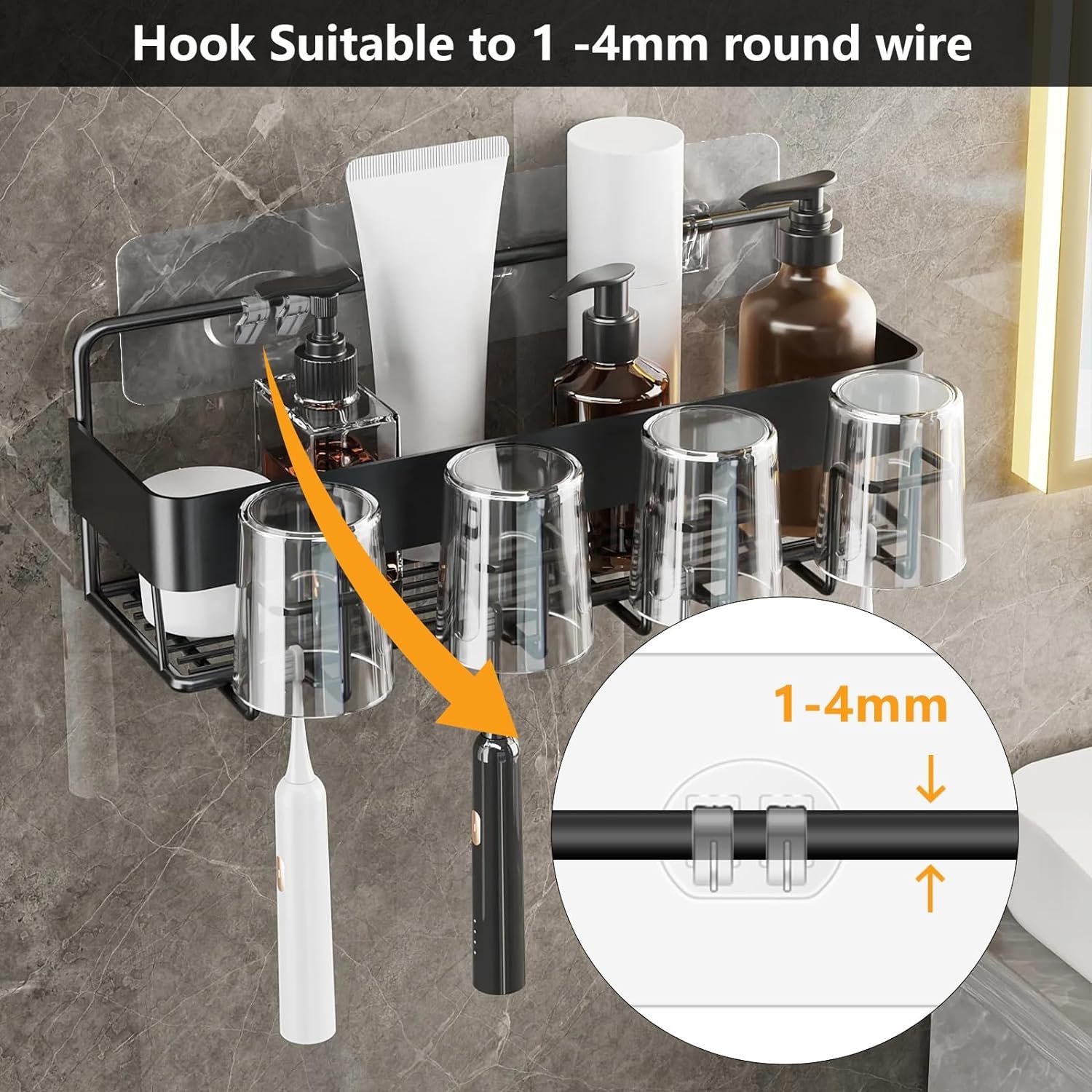 Wide Application: The adhesive hooks can be applied on tiles, marble, glass,metal,smooth wood, metal, stainless steel surfaces, which is suitable for corner shelf basket, bathroom storage shelves, kitchen racks and soap holder.