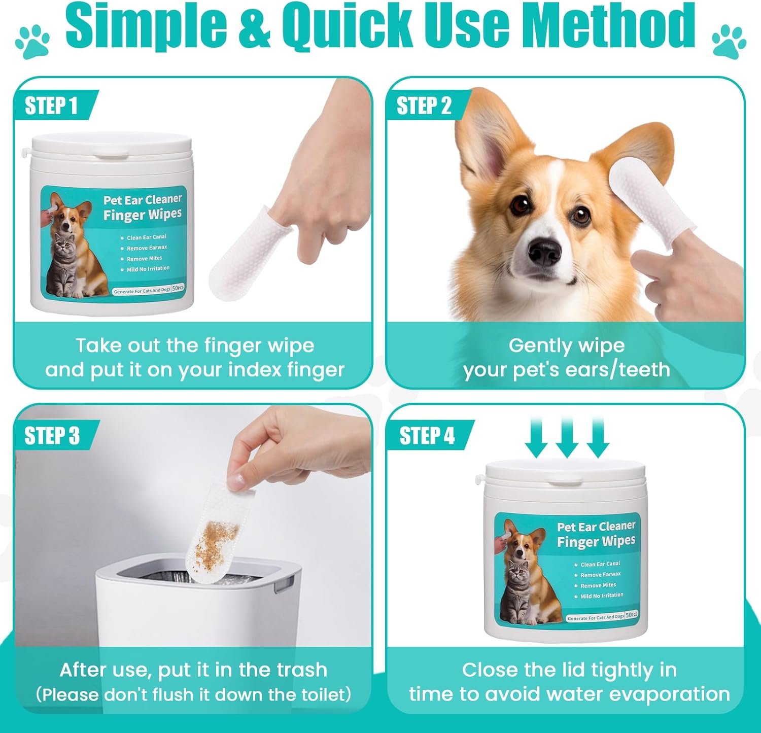 step1:Take out the finger wipe and put it on your index fingerstep2:Gently wipe your pet’s ears/teethstep3:After use, put it in the trash(Please don’t flush it down the toilet)step4:Close the lid tightly in time to avoid water evaporation