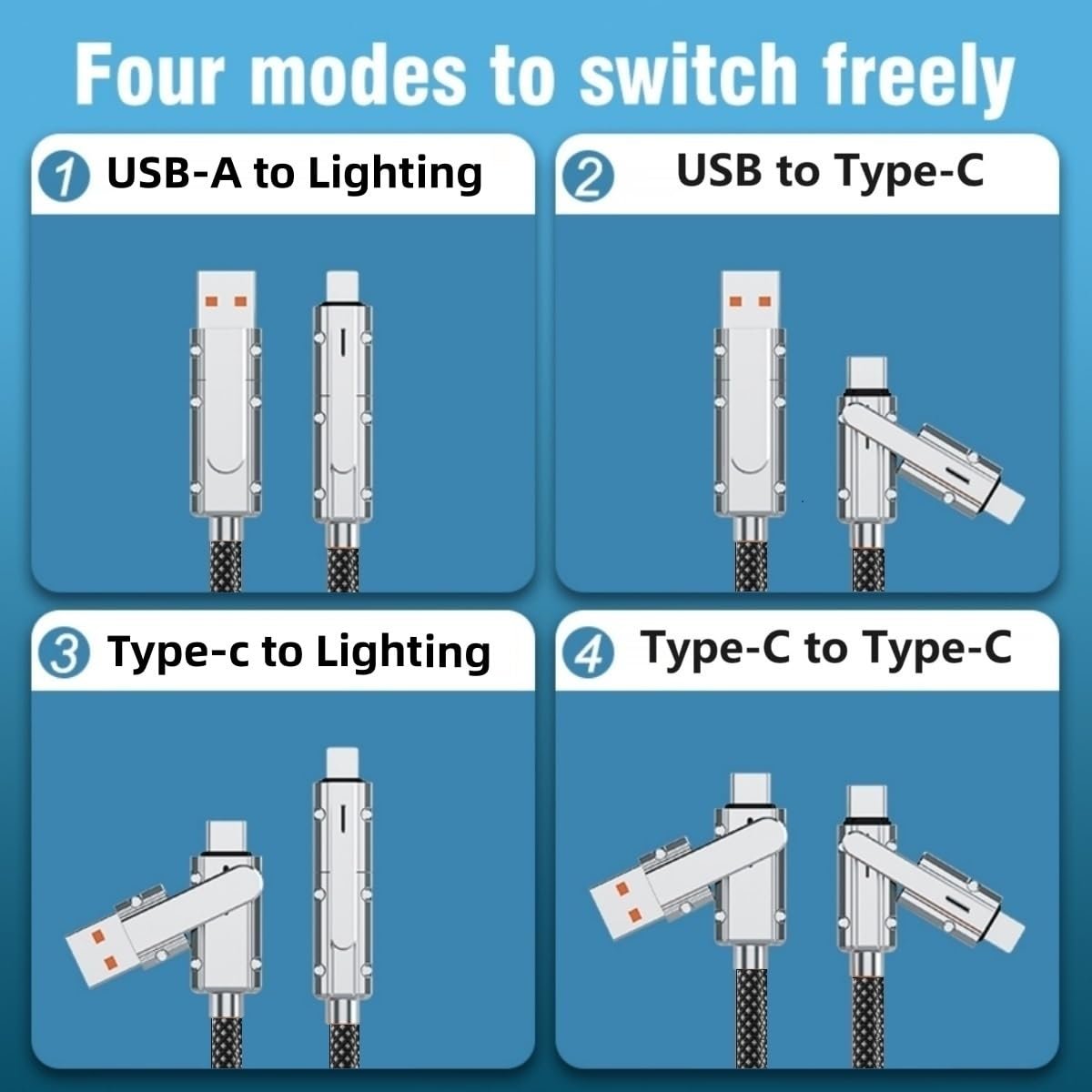 USB-C to C Charging Cable:Offer 4 charging mode conversion,detachable male plug,USB A to USB C;USB A to Lighting;USB C to USB C;USB C to Lighting,Support PD3.0/QC3.0/QC4.0 fast charging,max up to 100W