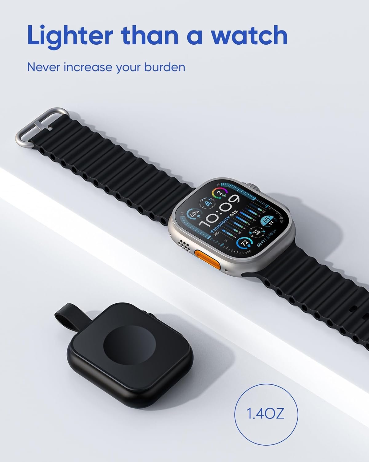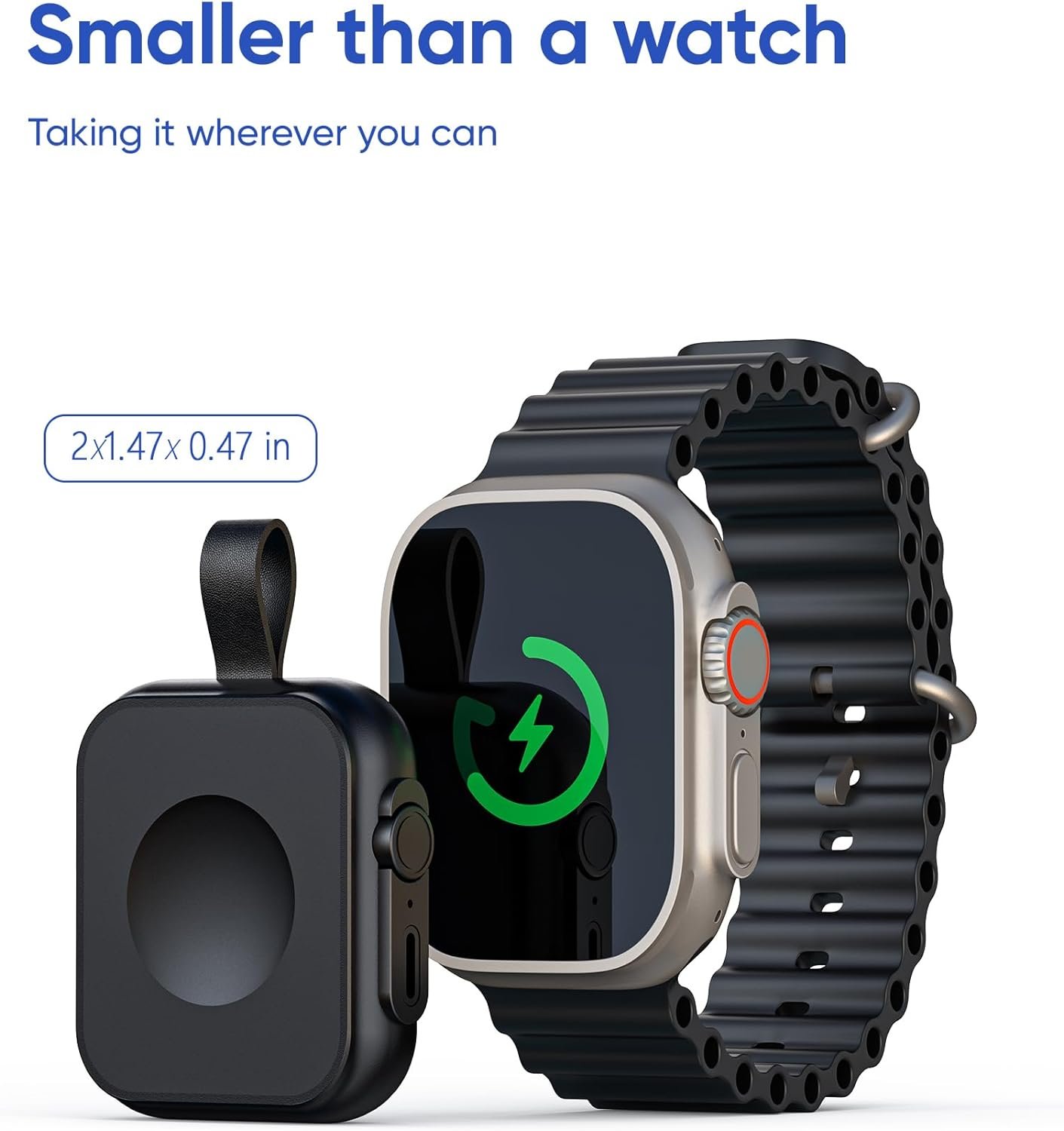 Of course, you wouldn’t want to carry a power bank as bulky as a brick. That’s why we’ve developed the smallest and lightest magnetic iwatch power bank(2×1.47x 0.47 in,1.27OZ), which is even smaller than the standard size of an apple watch. It’s incredibly portable and won’t take up much space.