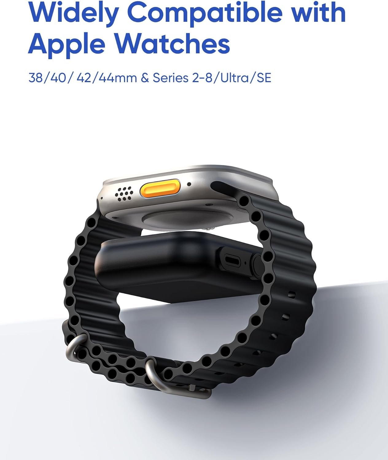 Most importantly, our power banks ensure your safety, and we’re committed to providing the best after-sale service to protect your watch. Our portable charger is compatible with Apple Watch Series 9/8/7/6/SE/5/4/3/2/1, including the Ultra and Ultra 2 models in various sizes (49mm, 45mm, 44mm, 42mm, 41mm, 40mm, 38mm).