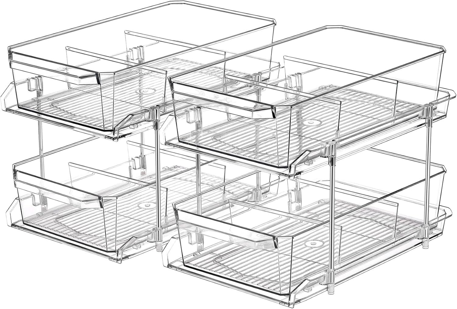 2 Set, 2 Tier Clear Organizer with Dividers for Cabinet, Shlef, Counter – MultiUse Slide-Out Storage Container – Kitchen, Pantry, Medicine Cupboard Bins, Bathroom, Vanity Makeup, Under Sink Organizing