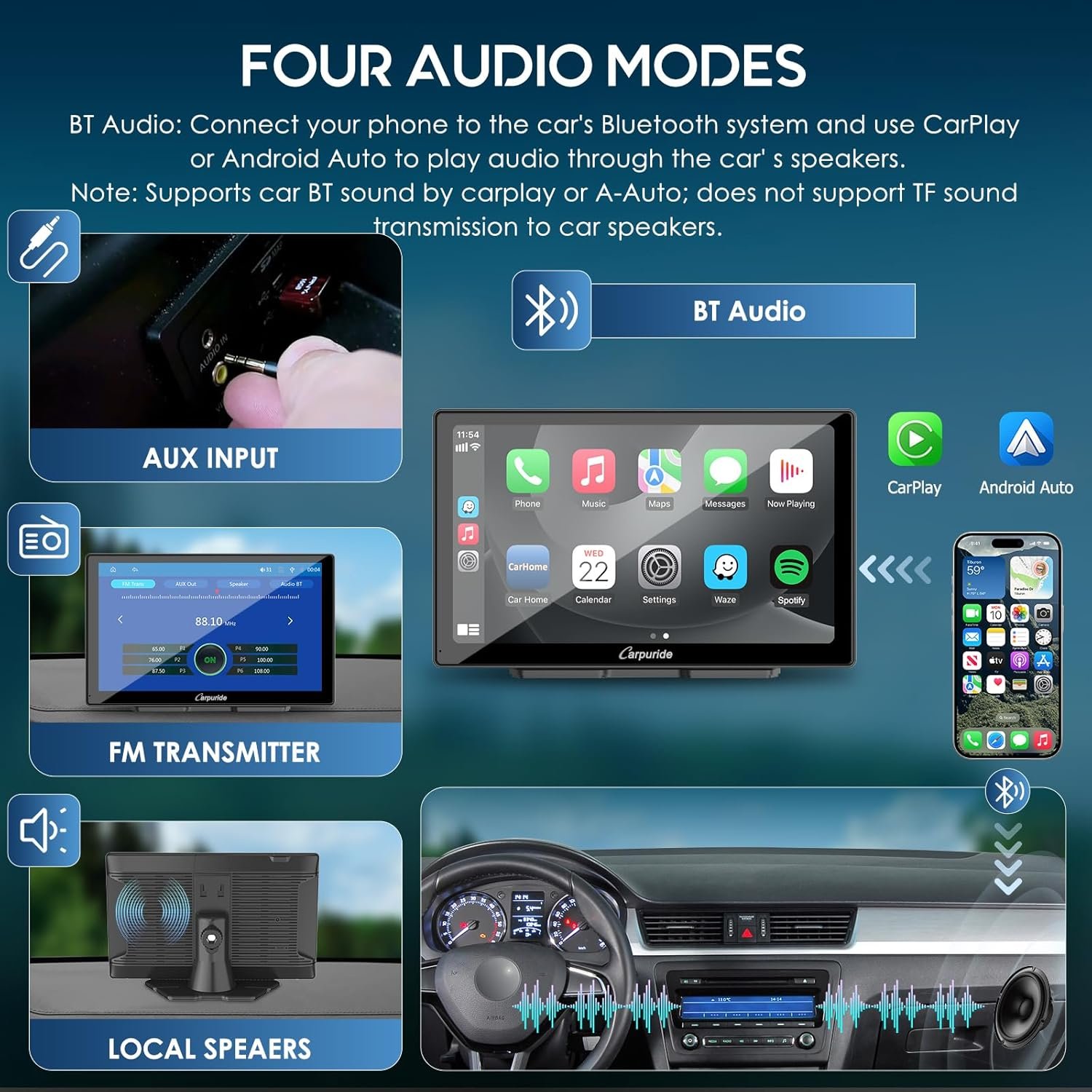 【Apple Car Play and A- Auto】Elevate your driving experience with the CARPURIDE 9″ Portable Car Stereo, compatible with both Apple CarPlay and Android Auto. Whether you choose a wireless or wired connection, this system puts your phone’s finest features at your fingertips on a clear, easy-to-use HD touchscreen. Effortlessly manage GPS navigation, messaging, phone calls, and enjoy bluetooth music along with Siri functionality.