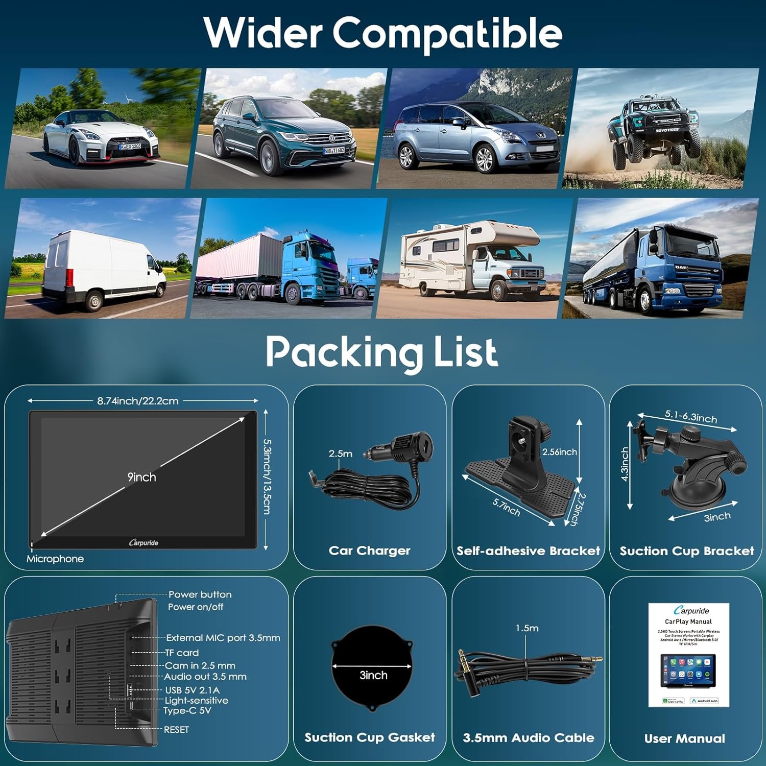 【Universal Compatibility】The CARPURIDE 9 inch car stereo system is remarkably adaptable, powered by a 5V 2.5A Type-C connector via the cigarette lighter or a high-speed USB charger, though the current must be 5V2.5A/5V3A to prevent the CarPlay screen from automatically shutting off due to insufficient power. Designed to operate within a voltage range of 12-24V, it is compatible with almost all cars, RVs, SUVs, pickups, and trucks, regardless of their make, model, or year.