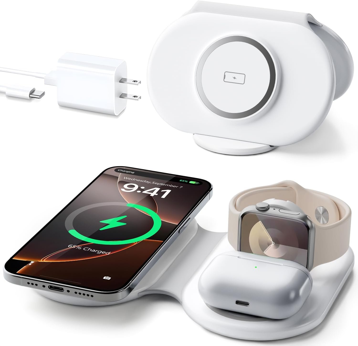 3 in 1 portable charger:The charging station for Apple multiple devices is a great option to organize your home, office, or meeting room. It lets you say goodbye to tangled cords and messy cables, keeping your space neat and organized