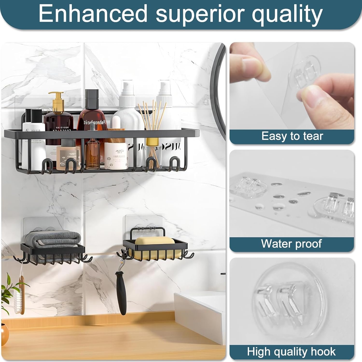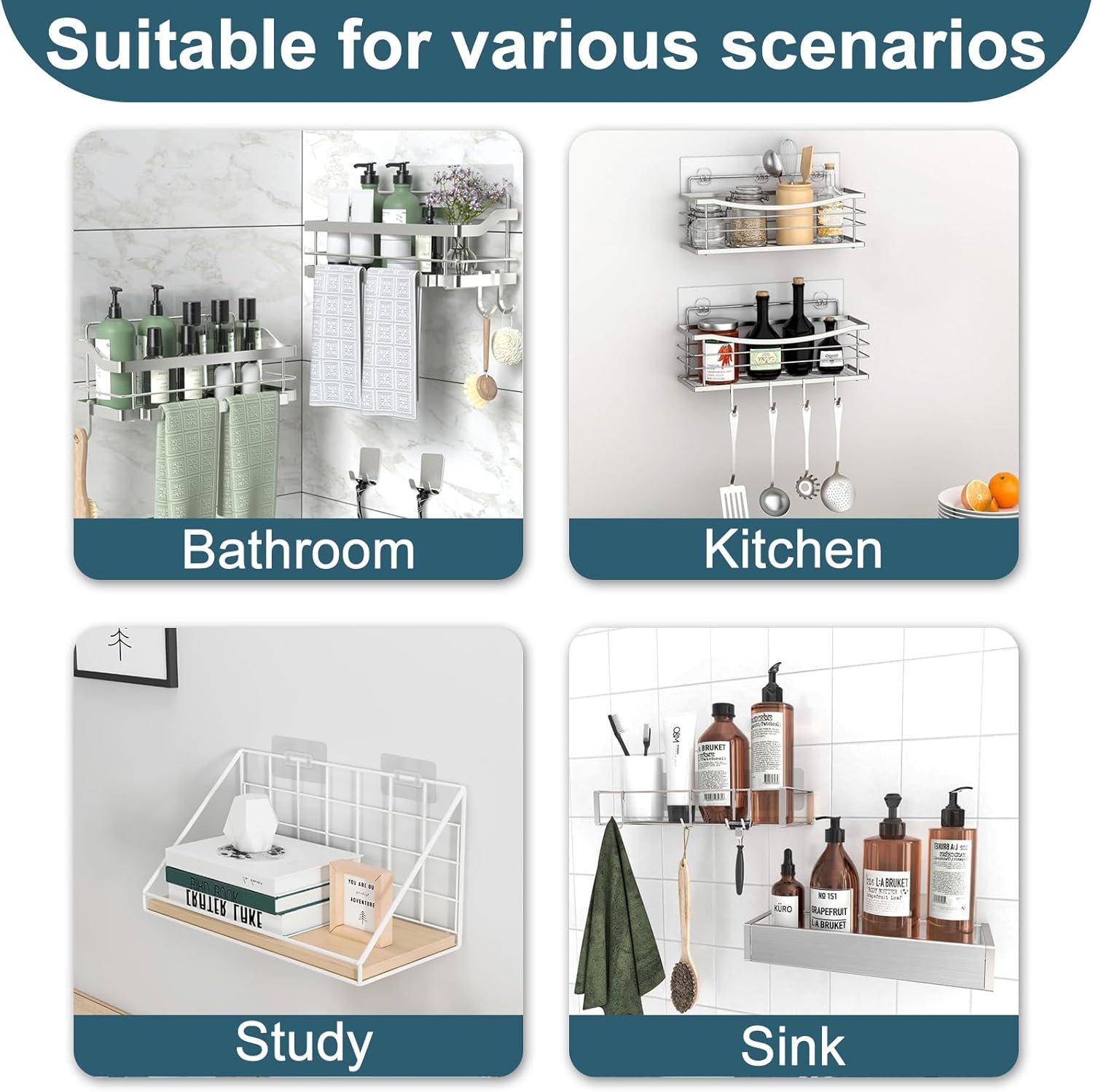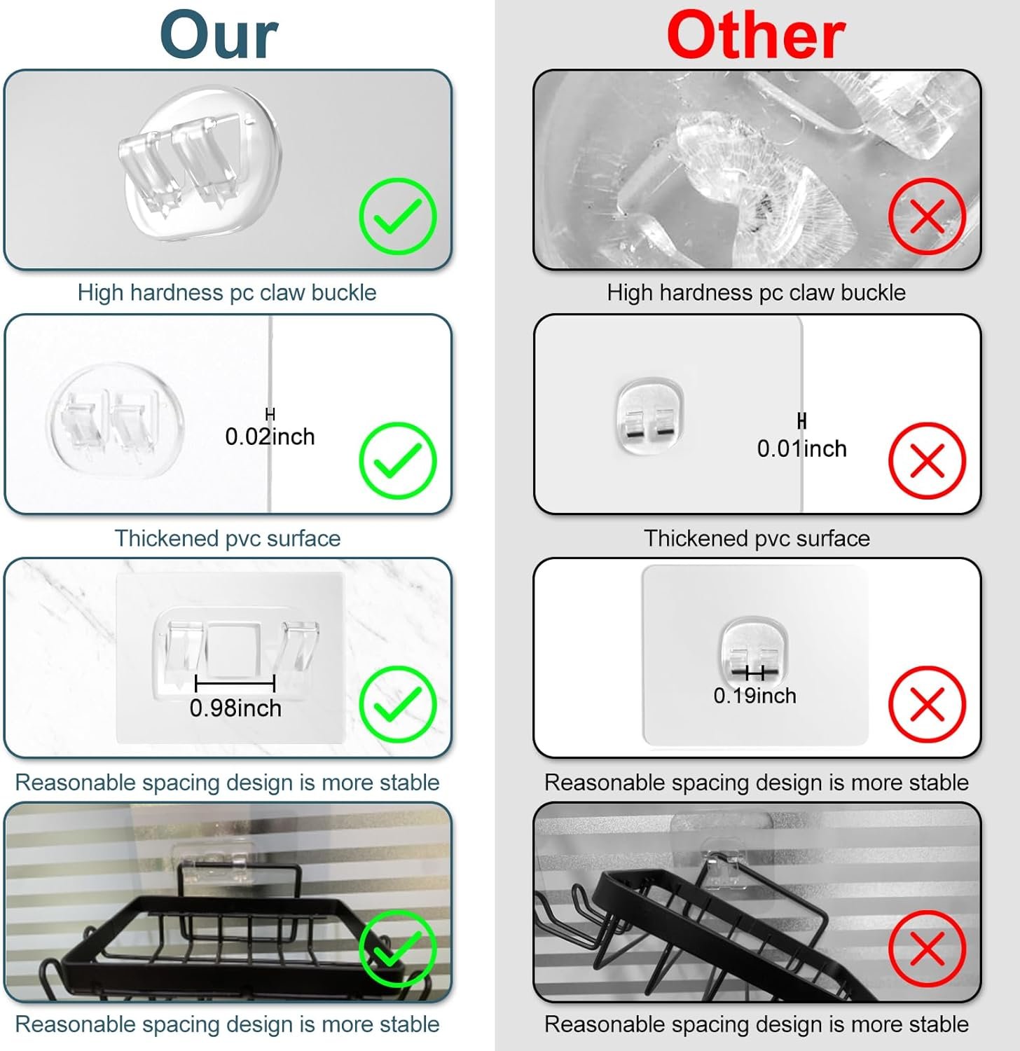 【Strong & Stable】: Adhesive for Shower Caddy Double hook design with proper spacing enhances shelf stability and can support substantial weight, ensuring safe item storage.