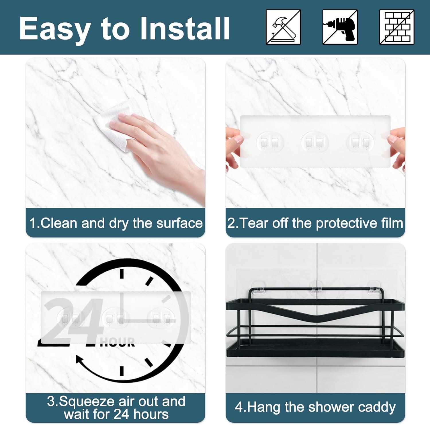 【Easy Installation】: Shower Caddy Adhesive Strips Simple and drill-free installation process. Clean the wall surface, peel off the protective film, press evenly to remove air bubbles, and wait 24 hours before hanging items.