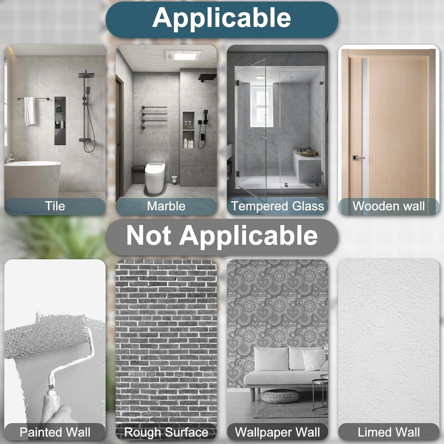【Versatile Use】: Shower Caddy Adhesive Suitable for smooth and hard surfaces such as glass, ceramic tiles, stainless steel, and flat marble. Avoid water, dust, oil, wax, wallpaper, painted or rough marble surfaces to maintain load-bearing capacity.