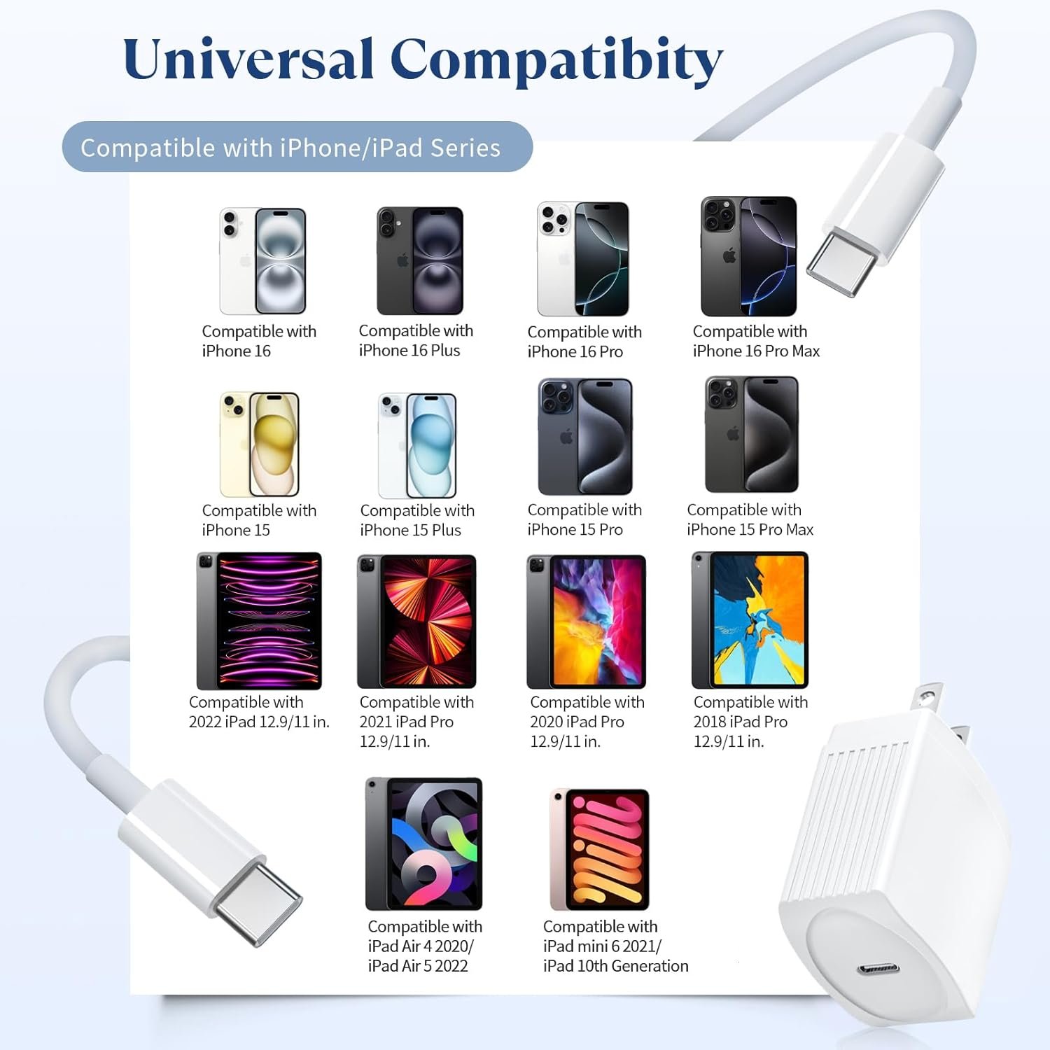 【Wide Compatibility】:20W PD adapter wall plugs support power delivery fast charge,compatible with iPhone 16/16 Plus/16 Pro/16 Pro Max/iPhone 15/15 Plus/15 Pro/15 Pro Max/ 2021/2020/2018 iPad Pro 12.9/11 inch,iPad Air 4, Mac Book Air 13 inch, Mac Book 12 inch, Gen 4/3, iPad Pro 11 Gen 2/1, iPad Air 4 .They can also fast charge for USB C enabled smartphones, compatible with Google Pixel 4/ 4 XL / 3a XL / 3 / XL / 2, Galaxy S8 S9 S10 S20 Plus, Note 10, LG and more.