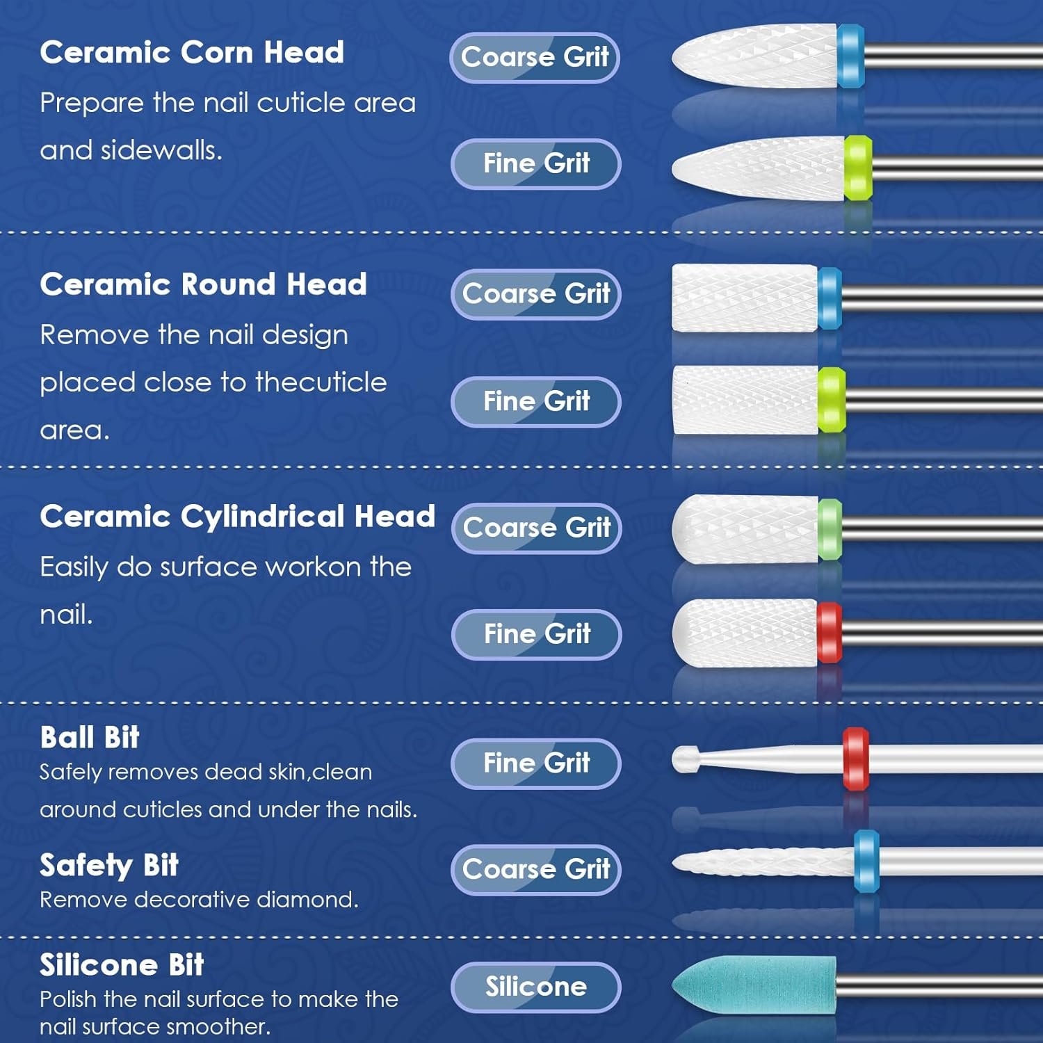 PREMIUM MATERIAL: Adopt top ceramic material and the highest precision standards diamond with superior strength, sharpness, and durability. You can be sure that these cuticle drill nail bits will last for a long time.