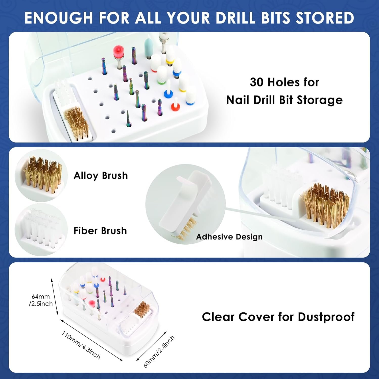 2IN1 TO STORE & CLEAN: Comes with dust-proof & anti-slider nail organizer and storage, which includes a 30-hole holder and 2-brush cleaner. The holder can fix and store bits well, the fiber brush meets bits’ daily cleaning needs, and the alloy brush quickly removes stubborn residue. The clear cover of the nail cleaner effectively blocks the dirt splashed out and protects cleaning brushes, prolonging service life. NOTE: The brush needs to remove the adhesive and stick it into the storage box.