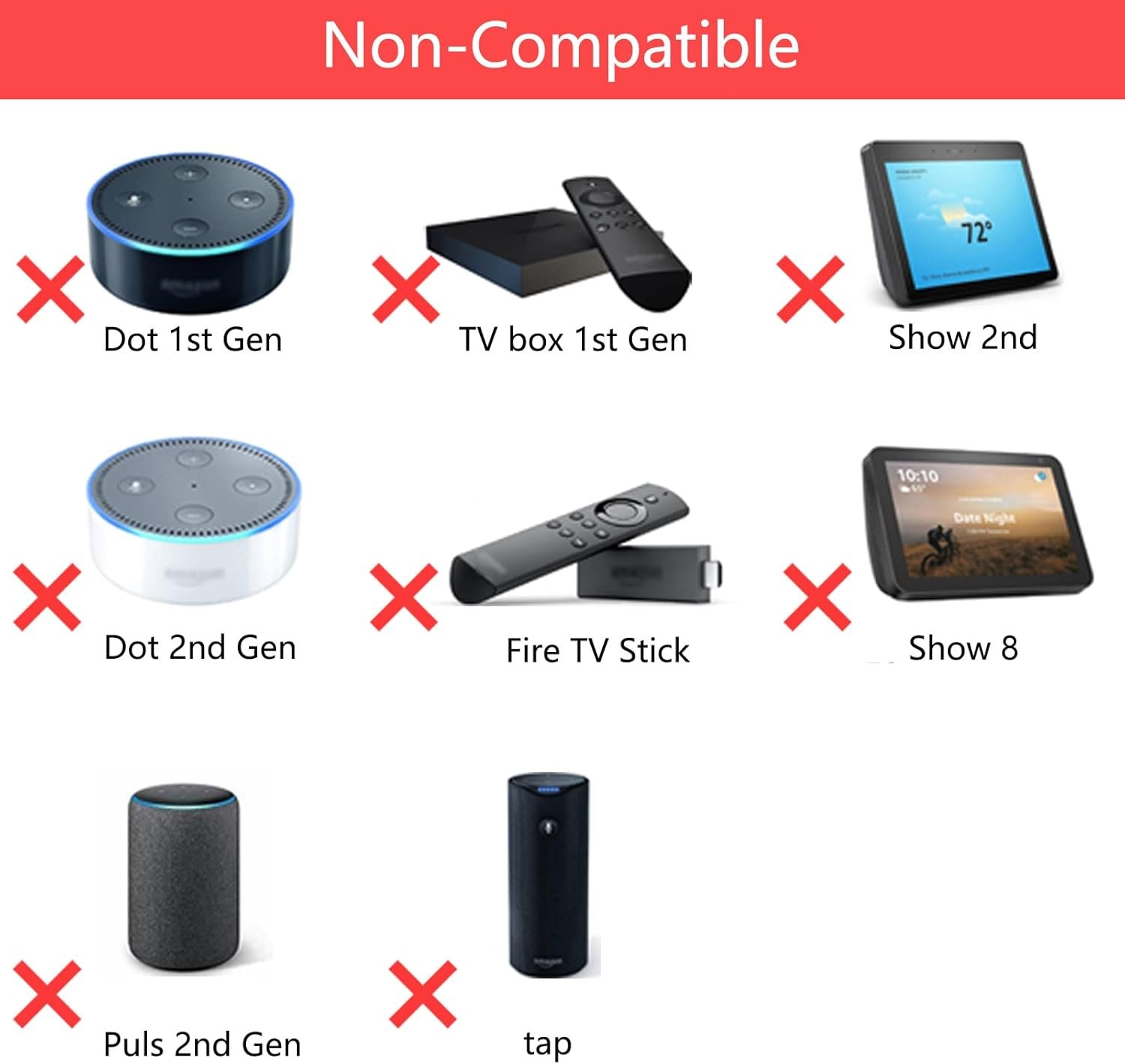 Non-Compatible: for Echo Dot 1st Gen, for Echo Dot 2nd Gen, for Echo Dot 3rd , for Echo Dot 4th , for Echo Puls 2nd Gen, for Echo Show 2nd Gen, for Echo Show 5, for Echo Show 8, for Echo Spot, TV box 1st Gen, Fire TV Stick, for Amazon tap